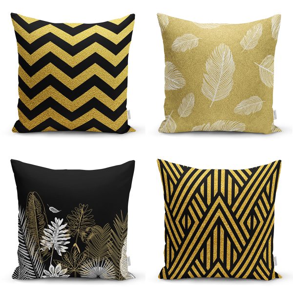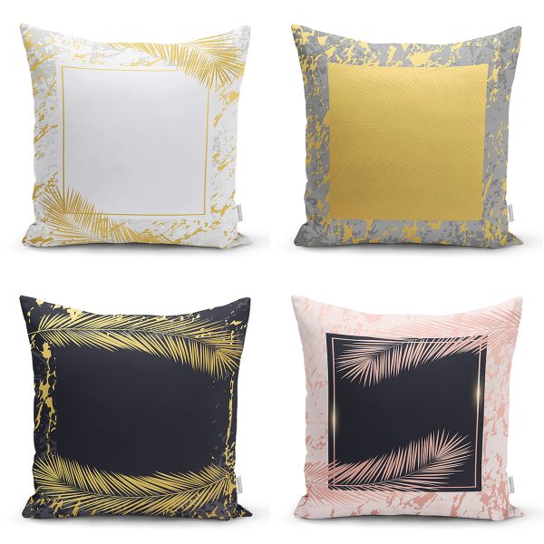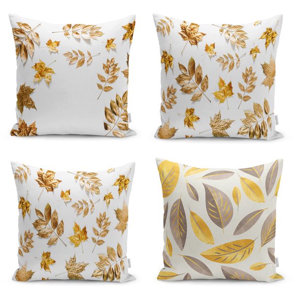 4’lü Altın Varaklı Yaprak Tasarımlı Modern Yastık Kırlent Kılıf Seti