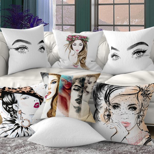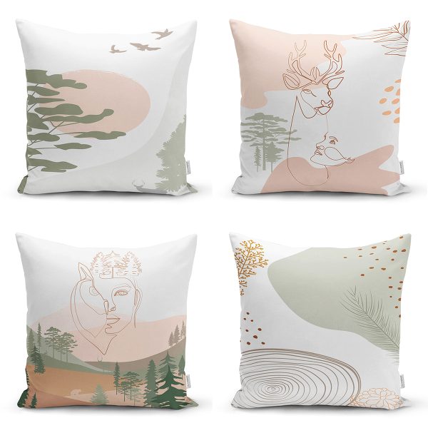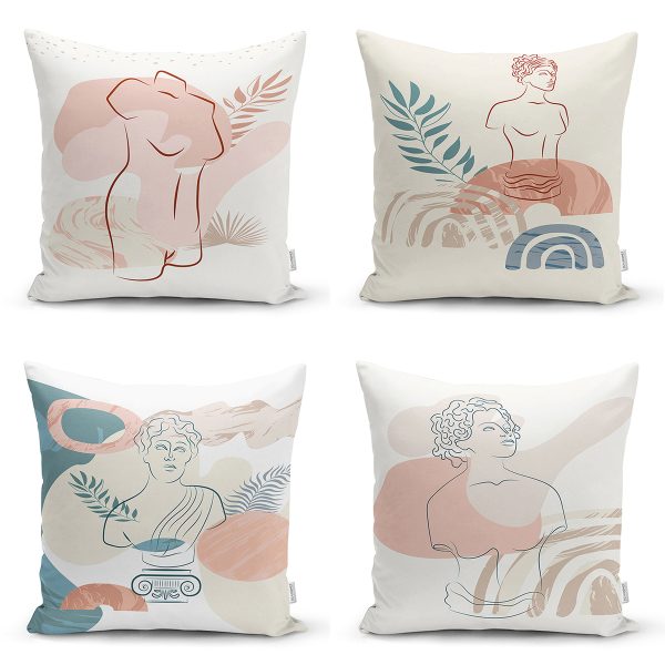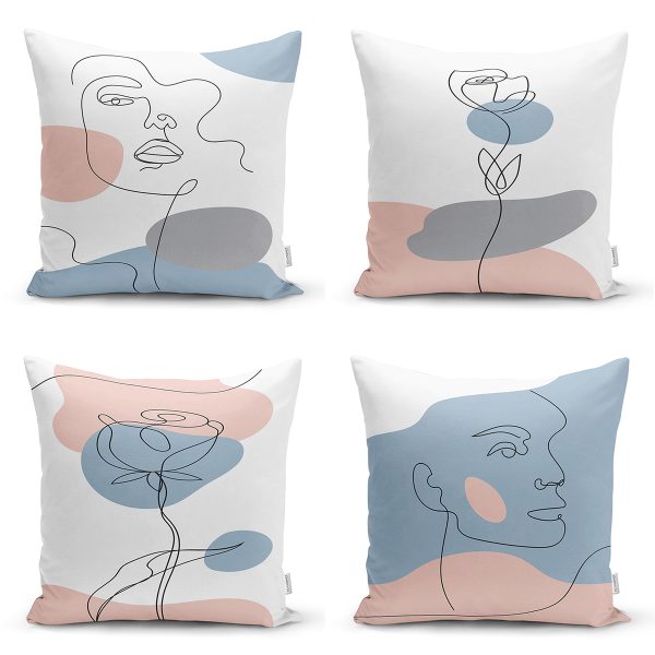 4’lü Renkli Zemin Üzerinde Onedraw Çizimli Bayan Silüeti Modern Yastık Kırlent Kılıf Seti