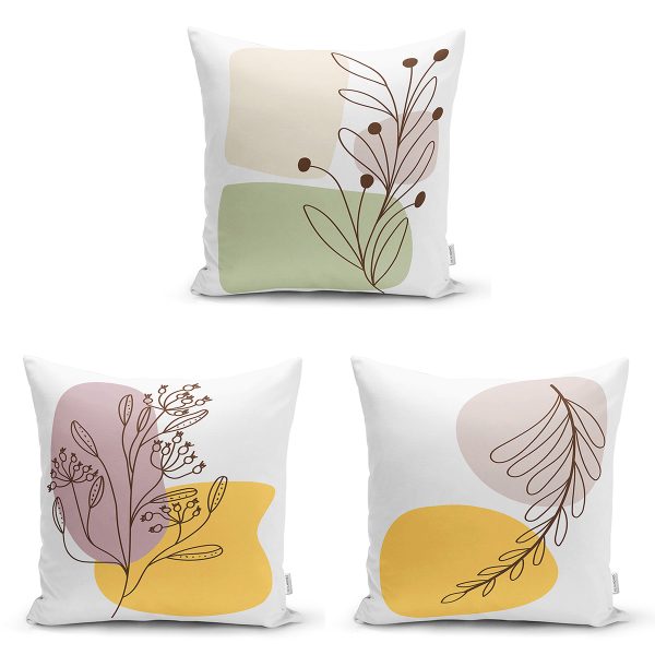 3’lü Beyaz Zemin Üzerinde Renkli Onedraw Çizimli Yaprak Desenli Modern Yastık Kırlent Kılıf Seti