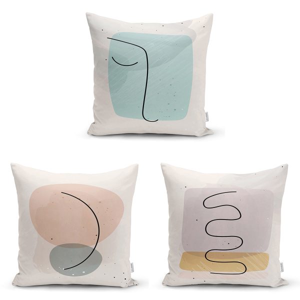 3’lü Beyaz Zemin Üzerinde Renkli Onedraw Çizimli Modern Yastık Kırlent Kılıf Seti
