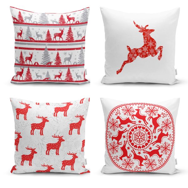 Realhomes Kırmızı Beyaz Yılbaşı Geyikleri 4’lü Yastık Kırlent Kılıfı