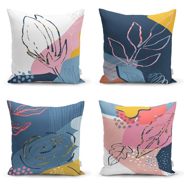 4’lü Renkli Zemin Üzerinde Onedraw Çizimli Yaprak Desenli Modern Yastık Kırlent Kılıf Seti