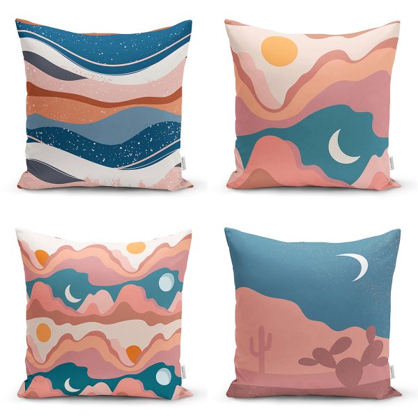 4’lü Dağ ve Ay Tasarımlı Dijital Baskılı Dekoratif Yastık Kırlent Kılıfı Seti