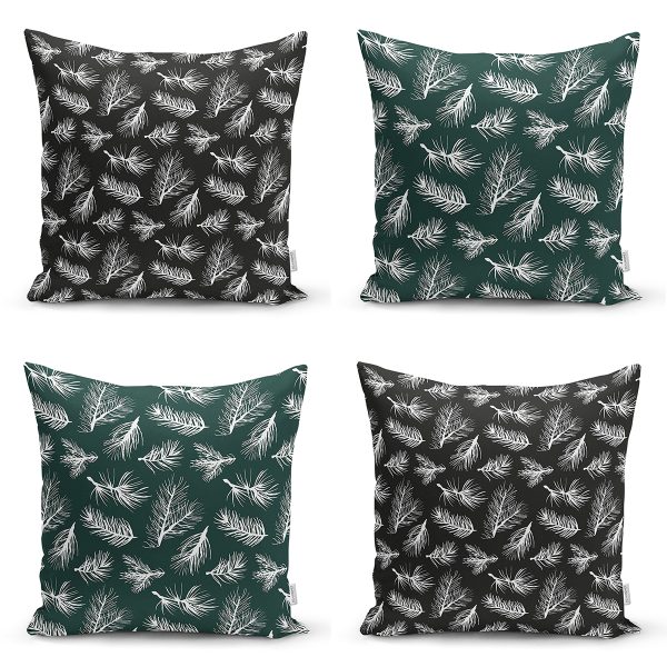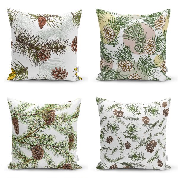 4’lü Yılbaşı Temalı Kozalak Ve Yapraklı Kombin Dijital Baskılı Modern Yastık Kırlent Kılıfı