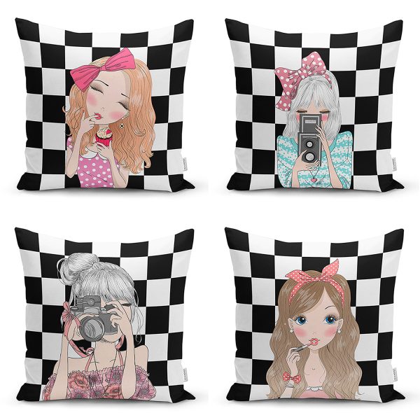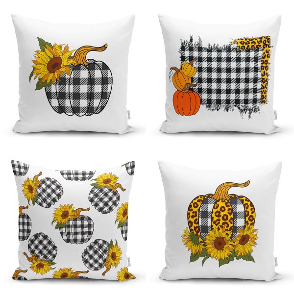 4’lü Siyah Beyaz Ekoseli Kabak Motifli Özel Tasarım Kombin Yastık Kırlent Kılıfı