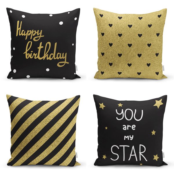 4’lü Siyah Zemin Üzerinde Gold Detaylı Modern Yastık Kırlent Kılıf Seti