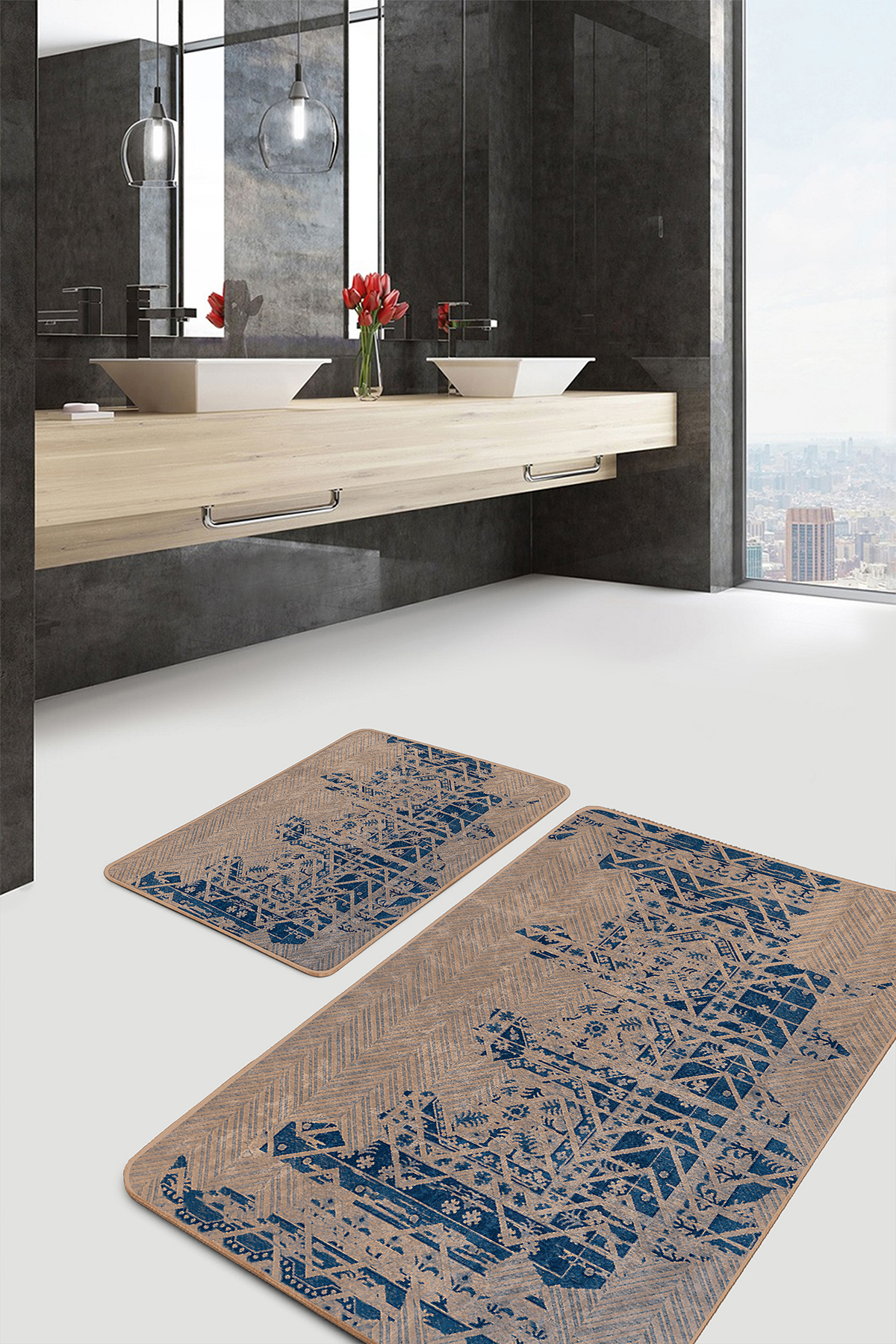 2’li Set Bej – Mavi Zeminde Otantik Motifli Kilim Desenli Eskitme Motifli Vintage 2’li Banyo & Mutfak Paspas Takımı