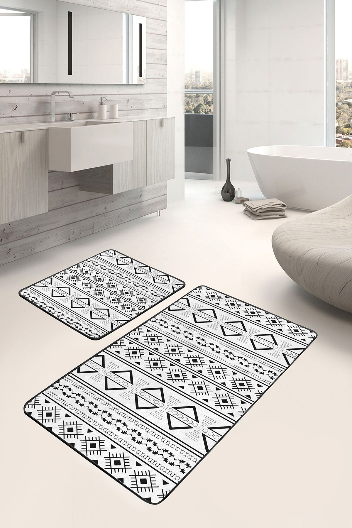 2’li Set Beyaz Zeminde Bohem Motifli Tribal Desenli Etnik Motifler Klasik 2’li Banyo & Mutfak Paspas Takımı