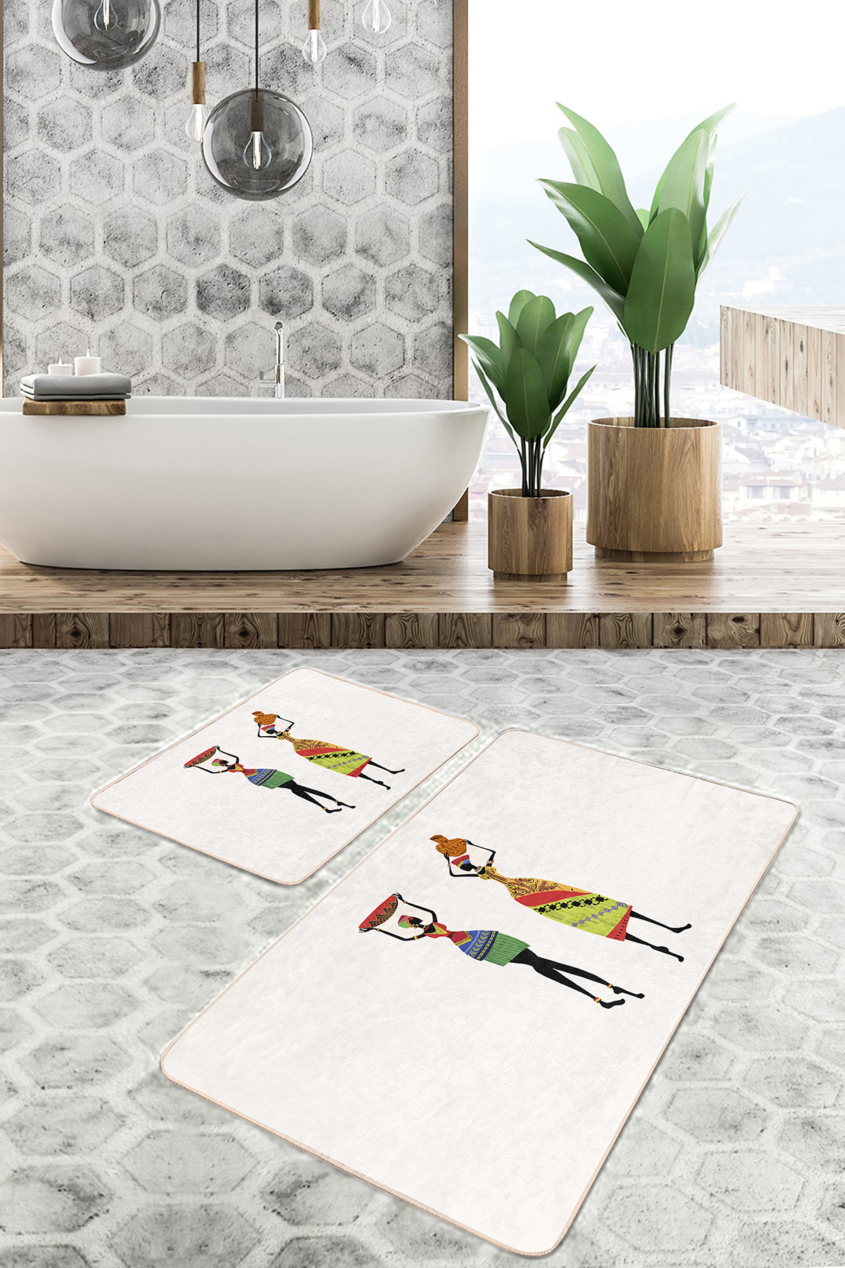 2’li Set Beyaz Zeminde Geleneksel Motifli Afrika Kadın Desenli Etnik Motifler Klasik 2’li Banyo & Mutfak Paspas Takımı