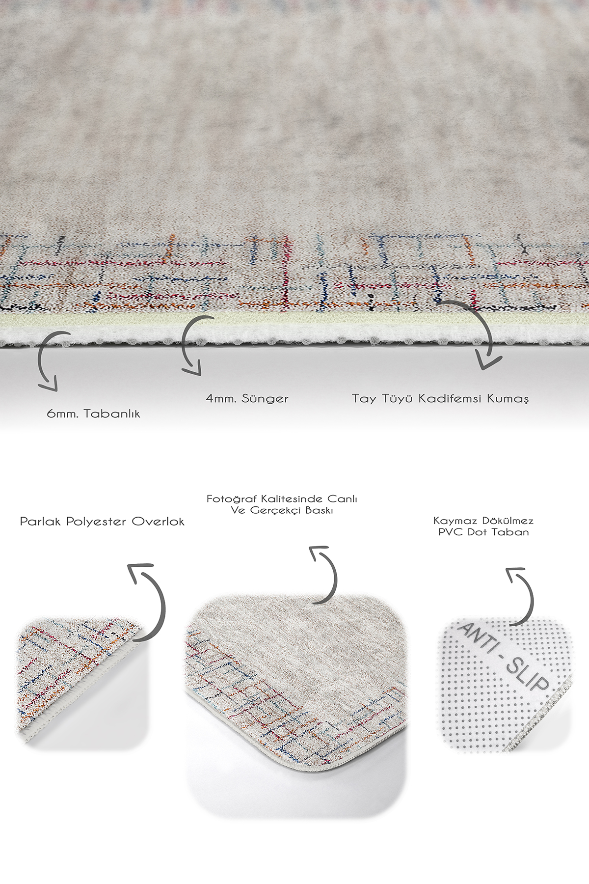 Tabanlık ve Dolgu: 6 mm Kaymaz dokuma tabanlıdır.