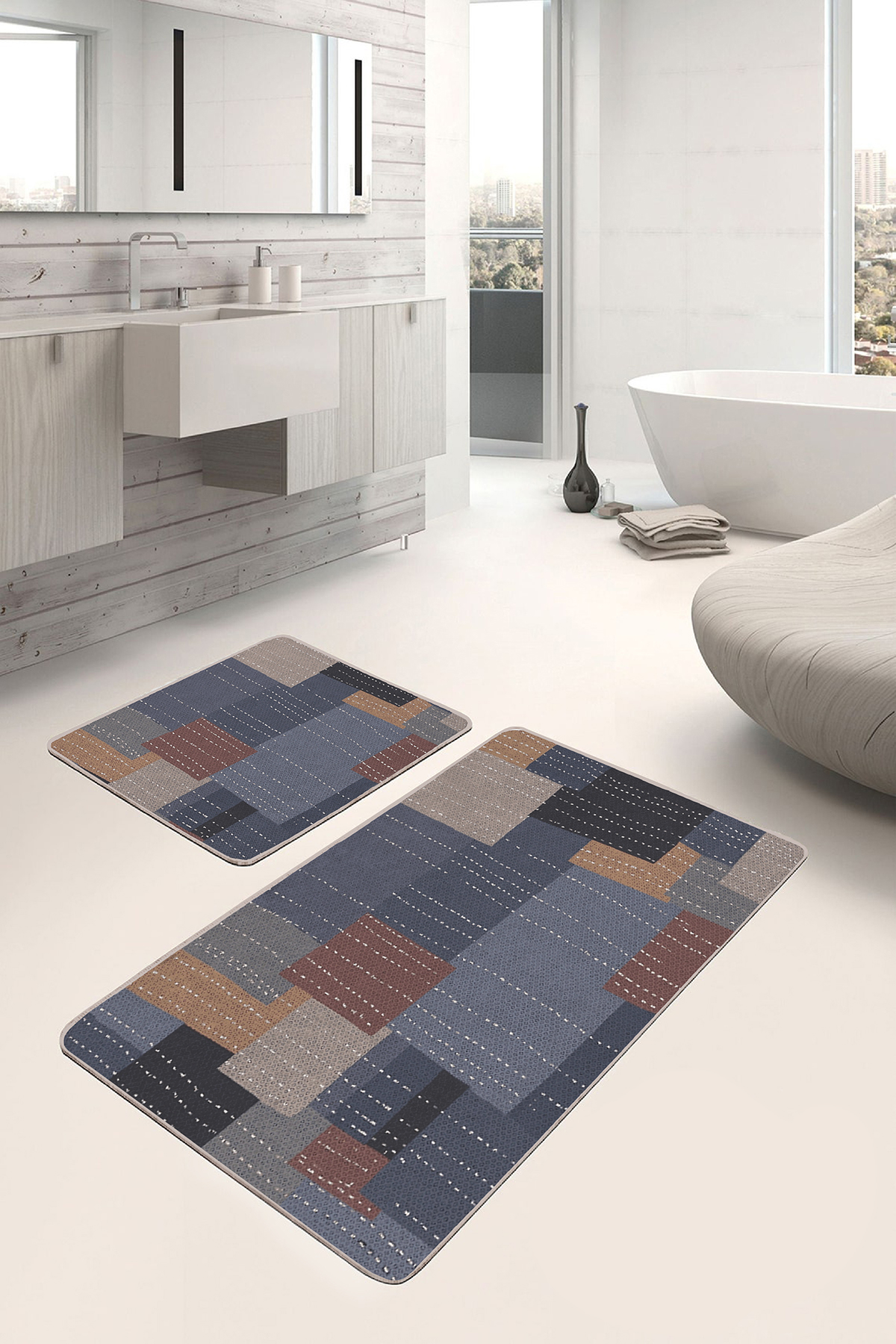 2’li Set Çok Renkli Zeminde Dokuma Halı Motifli Patchwork Desenli Geometrik Sade & Şık 2’li Banyo & Mutfak Paspas Takımı