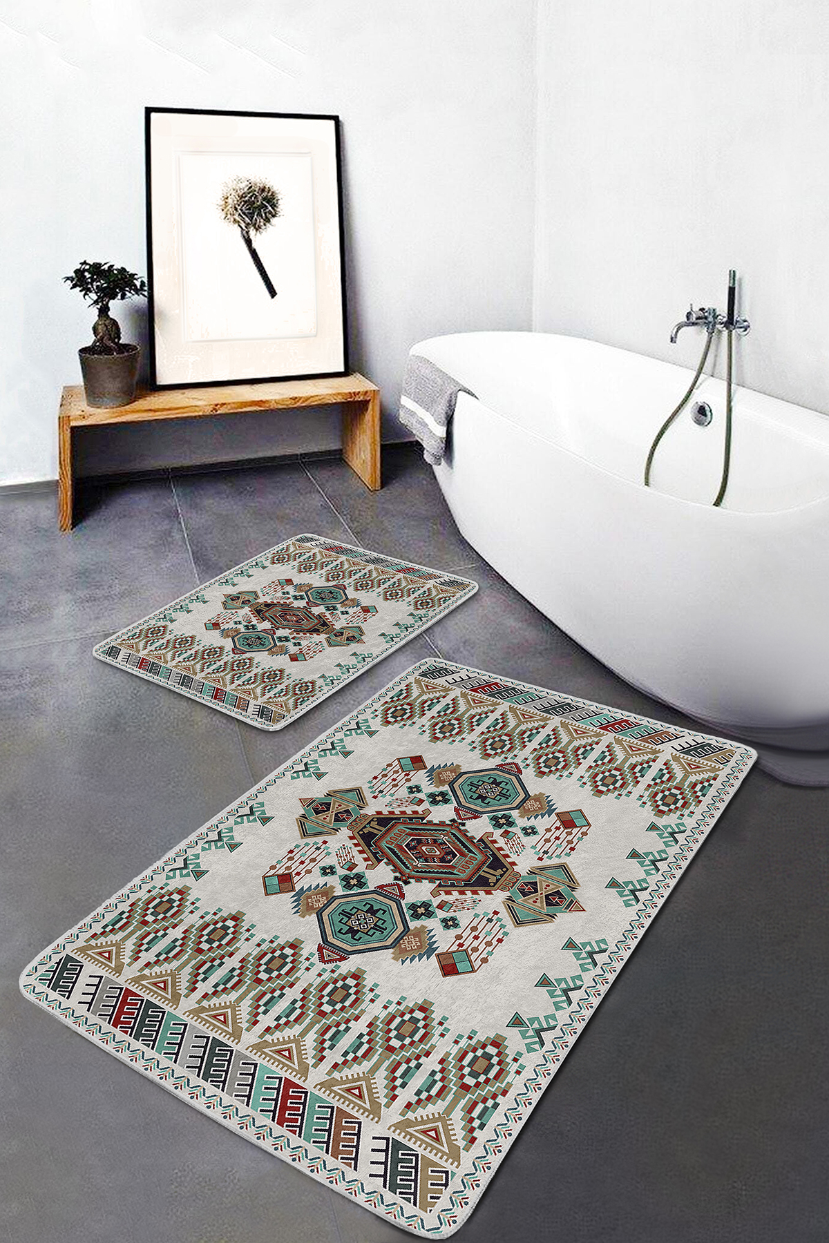 2’li Set Ekru Zeminde Antika Motifli Dokuma Halı Desenli Etnik Motifler Avangarde 2’li Banyo & Mutfak Paspas Takımı
