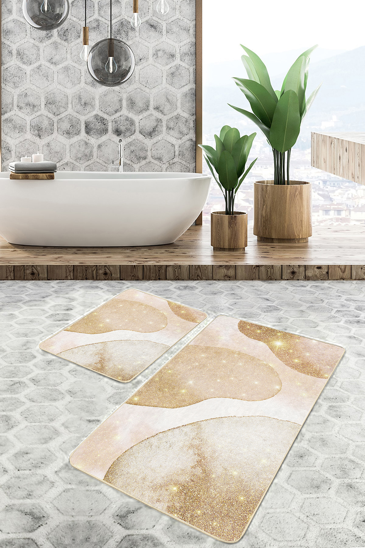 2’li Set Gold – Krem Zeminde Kanvas Motifli Boyama Desenli Bohem Sade & Şık 2’li Banyo & Mutfak Paspas Takımı