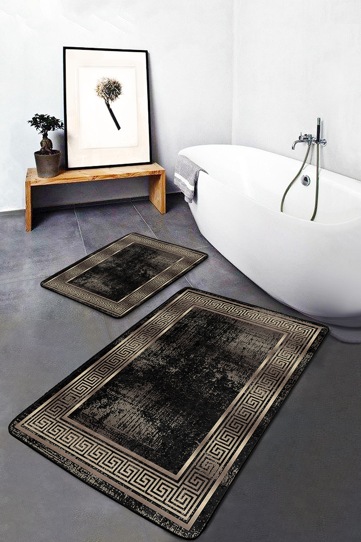 2’li Set Gold – Siyah Zeminde Çerçeveli Motifli Altın Desenli Geometrik Avangarde 2’li Banyo & Mutfak Paspas Takımı
