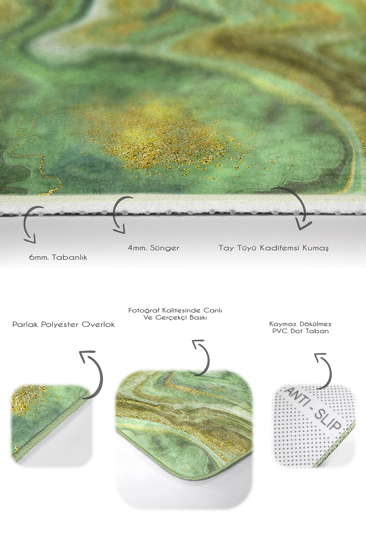 2’li Set Gold – Yeşil Zeminde Kanvas Motifli Altın Desenli Modern Sade & Şık 2’li Banyo & Mutfak Paspas Takımı