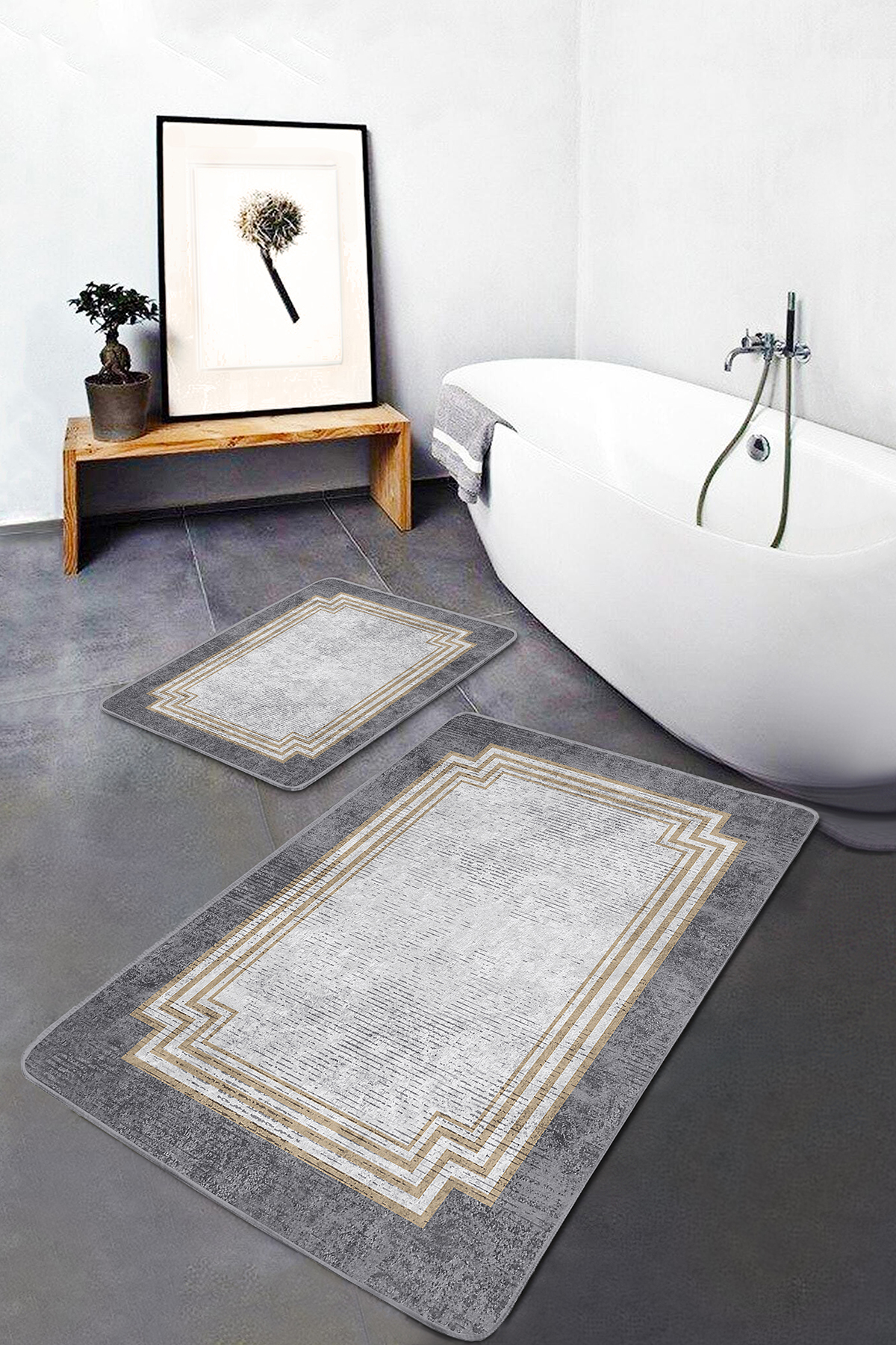 2’li Set Gri Zeminde Çerçeveli Motifli Antik Desenli Geometrik Klasik 2’li Banyo & Mutfak Paspas Takımı
