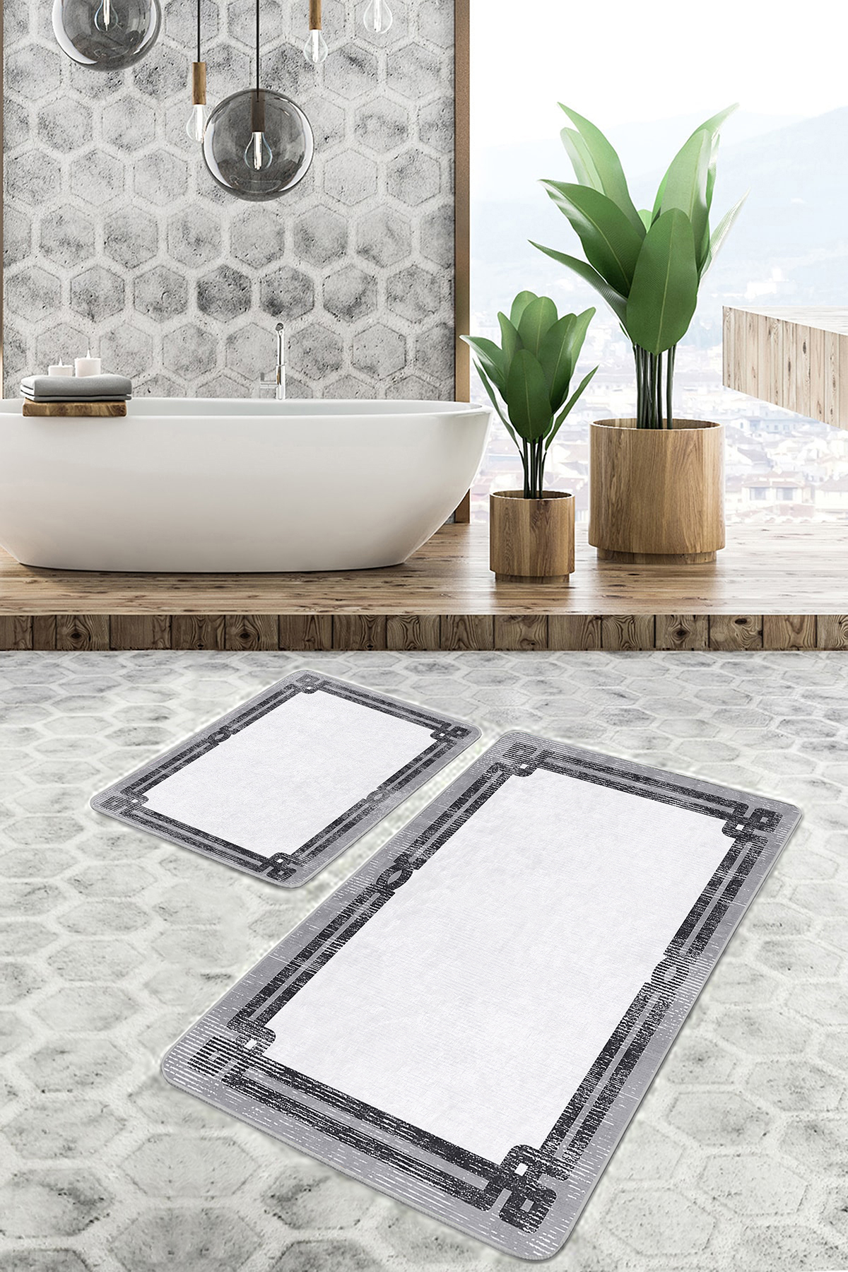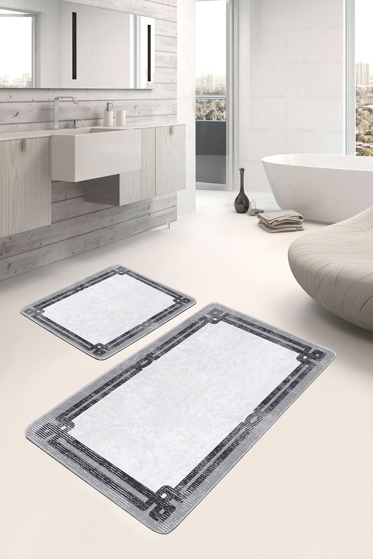 2’li Set Gri Zeminde Çerçeveli Motifli Eskitme Desenli Geometrik Klasik 2’li Banyo & Mutfak Paspas Takımı