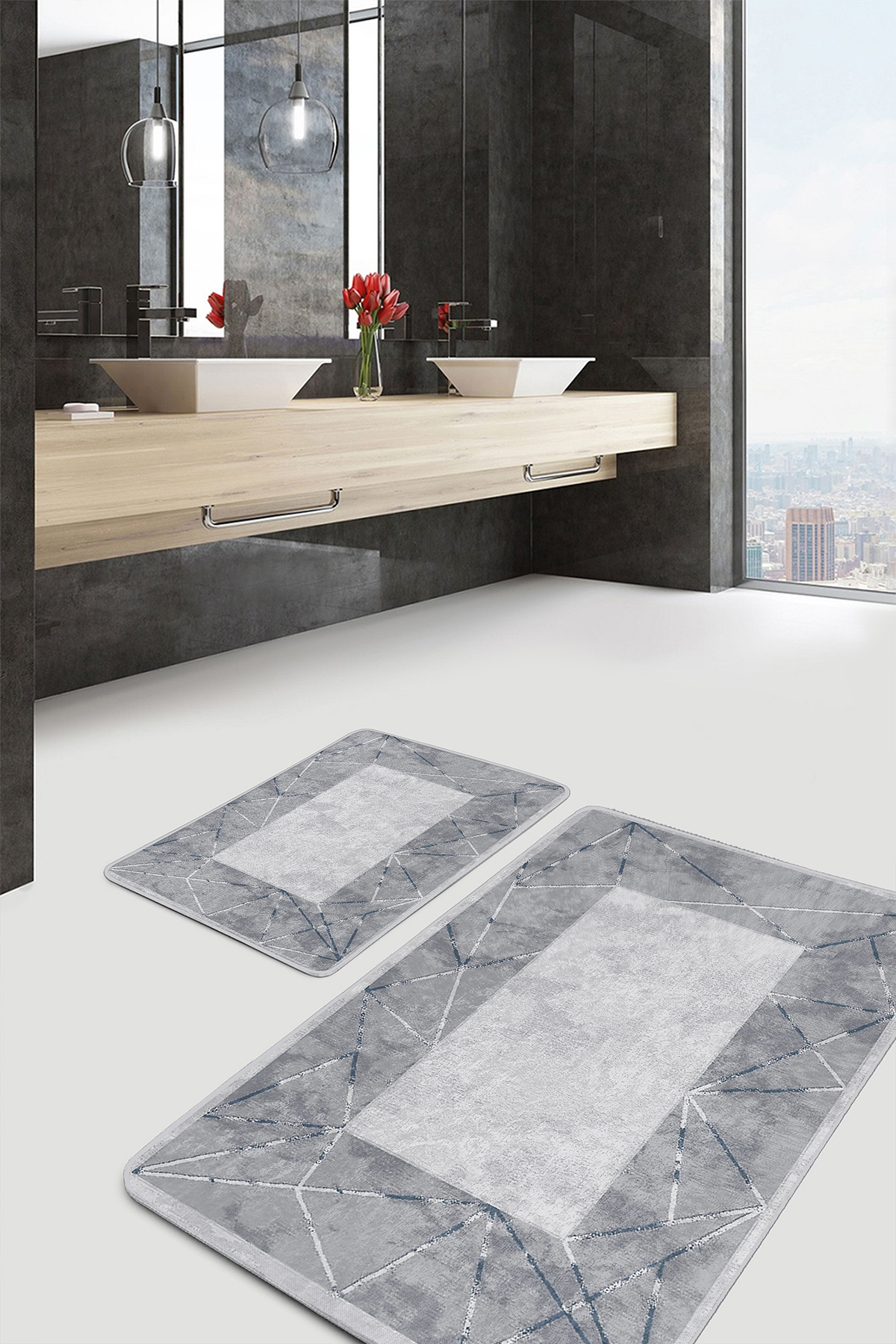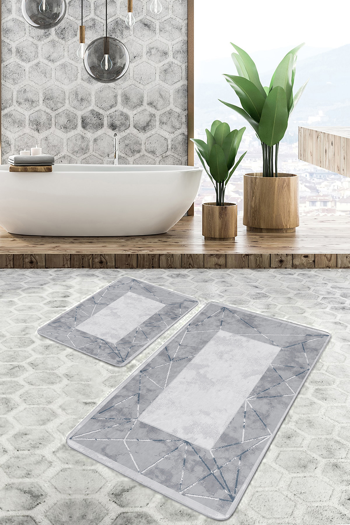 2’li Set Gri Zeminde Çerçeveli Motifli Mermer Desenli Sade & Şık Geometrik 2’li Banyo & Mutfak Paspas Takımı