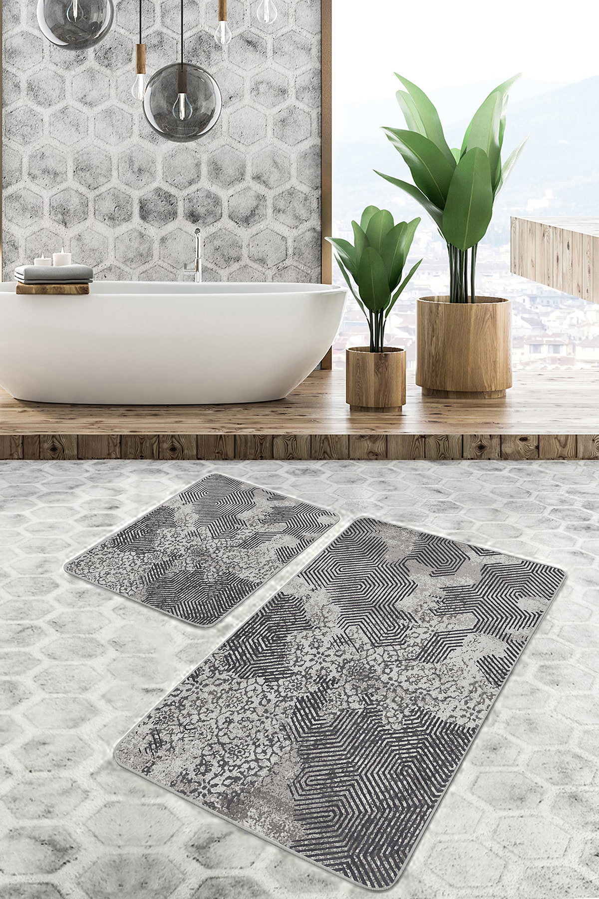 2’li Set Gri Zeminde Eskitme Motifli Geometrik Desenli Vintage Geometrik 2’li Banyo & Mutfak Paspas Takımı