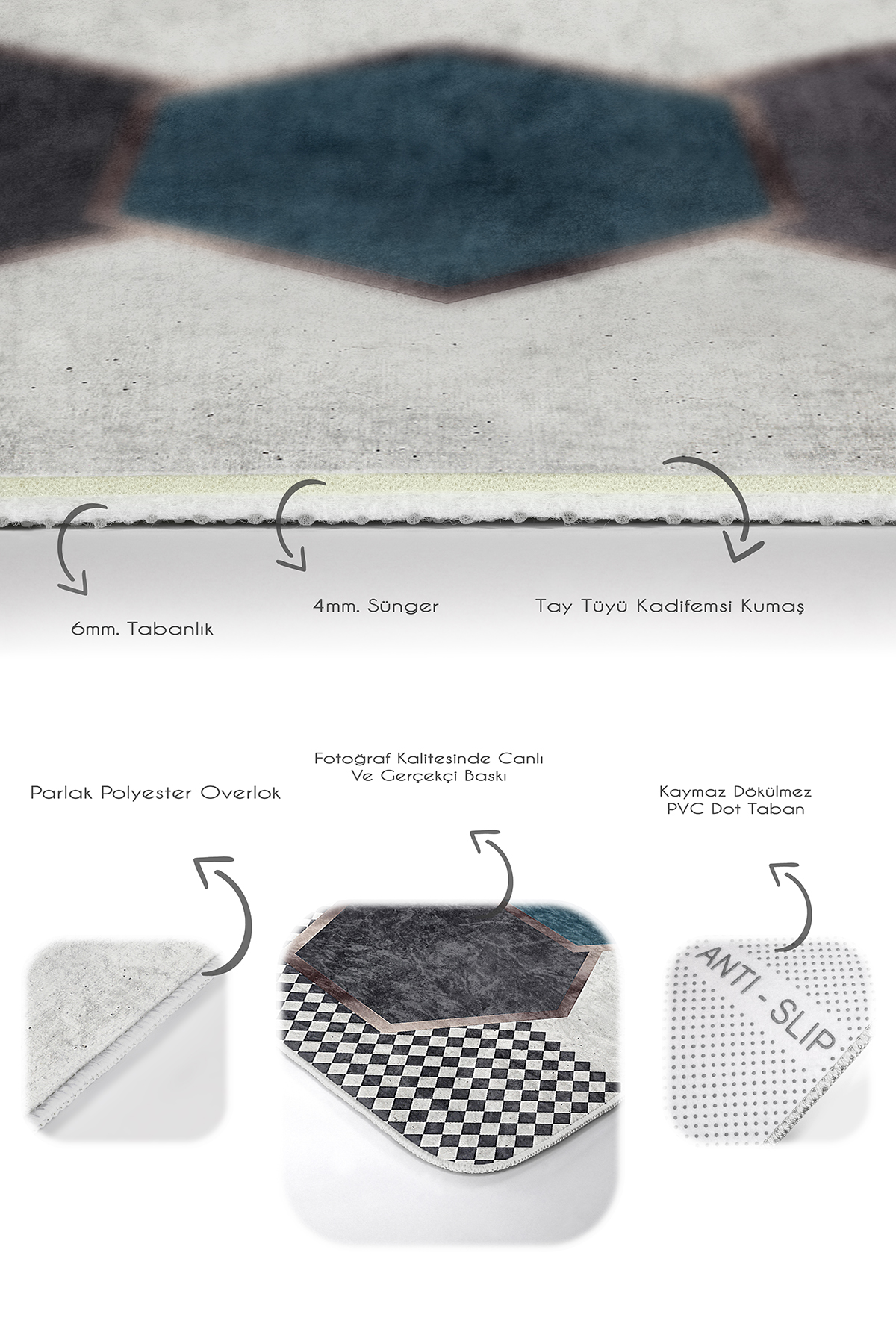 Tabanlık ve Dolgu: 6 mm Kaymaz dokuma tabanlıdır.