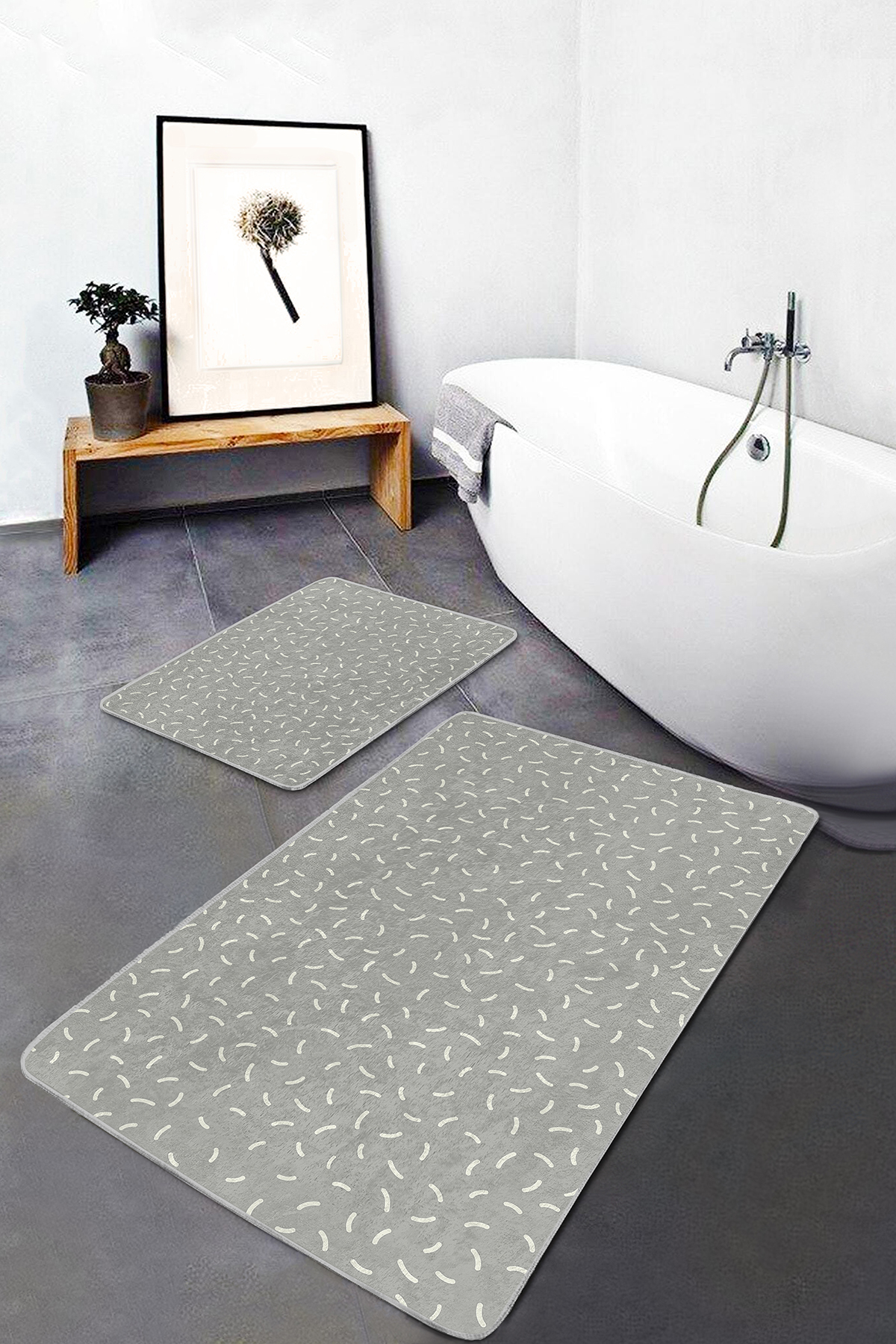 2’li Set Gri Zeminde Puantiyeli Motifli Çizgili Desenli Sade & Şık Klasik 2’li Banyo & Mutfak Paspas Takımı