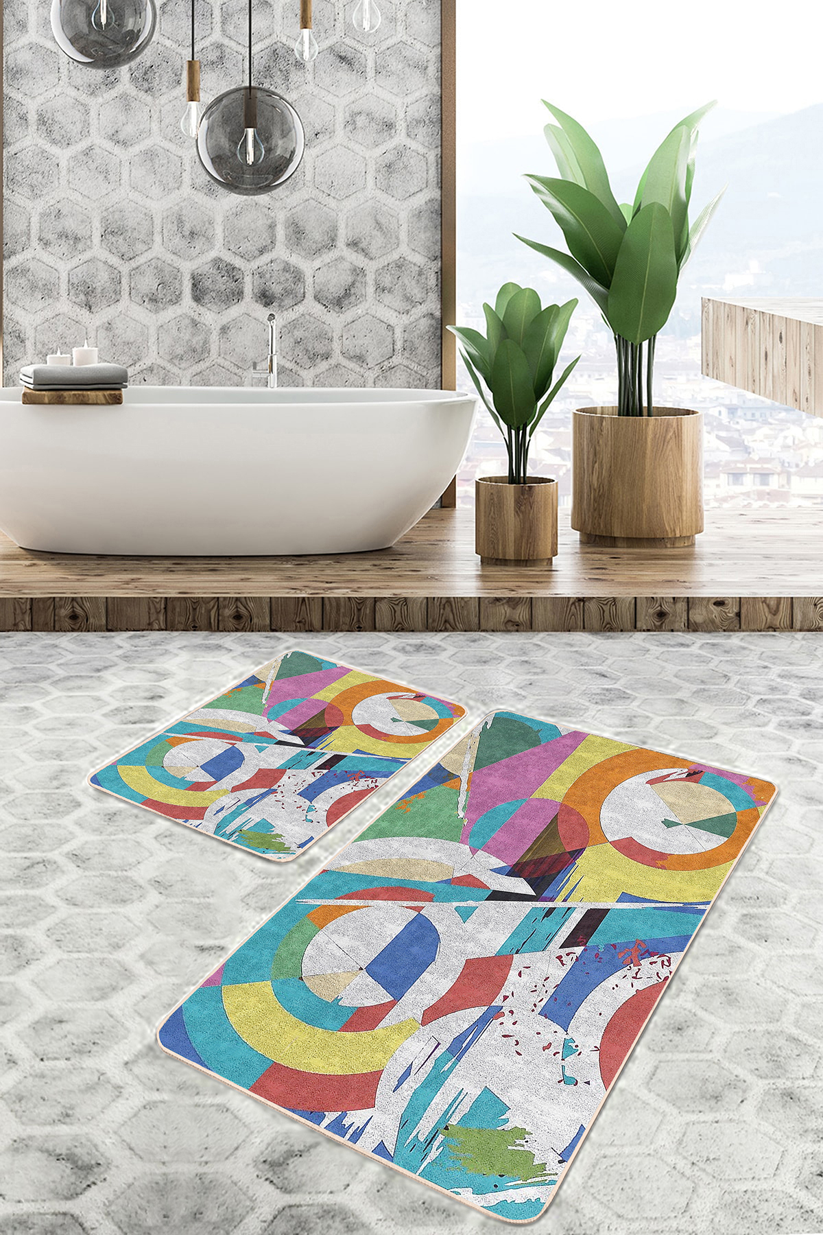 2’li Set Gri Zeminde Sulu Boya Motifli Modern Sanat Desenli Modern Geometrik 2’li Banyo & Mutfak Paspas Takımı
