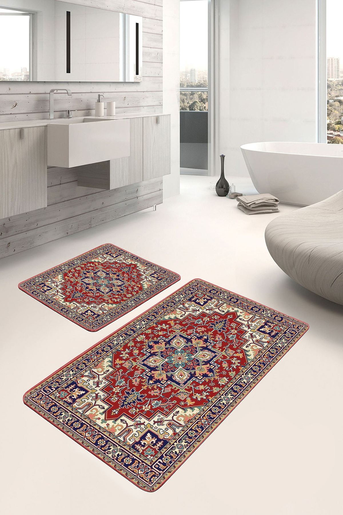 2’li Set Kırmızı Zeminde Hereke Motifli Dokuma Halı Desenli Vintage Avangarde 2’li Banyo & Mutfak Paspas Takımı