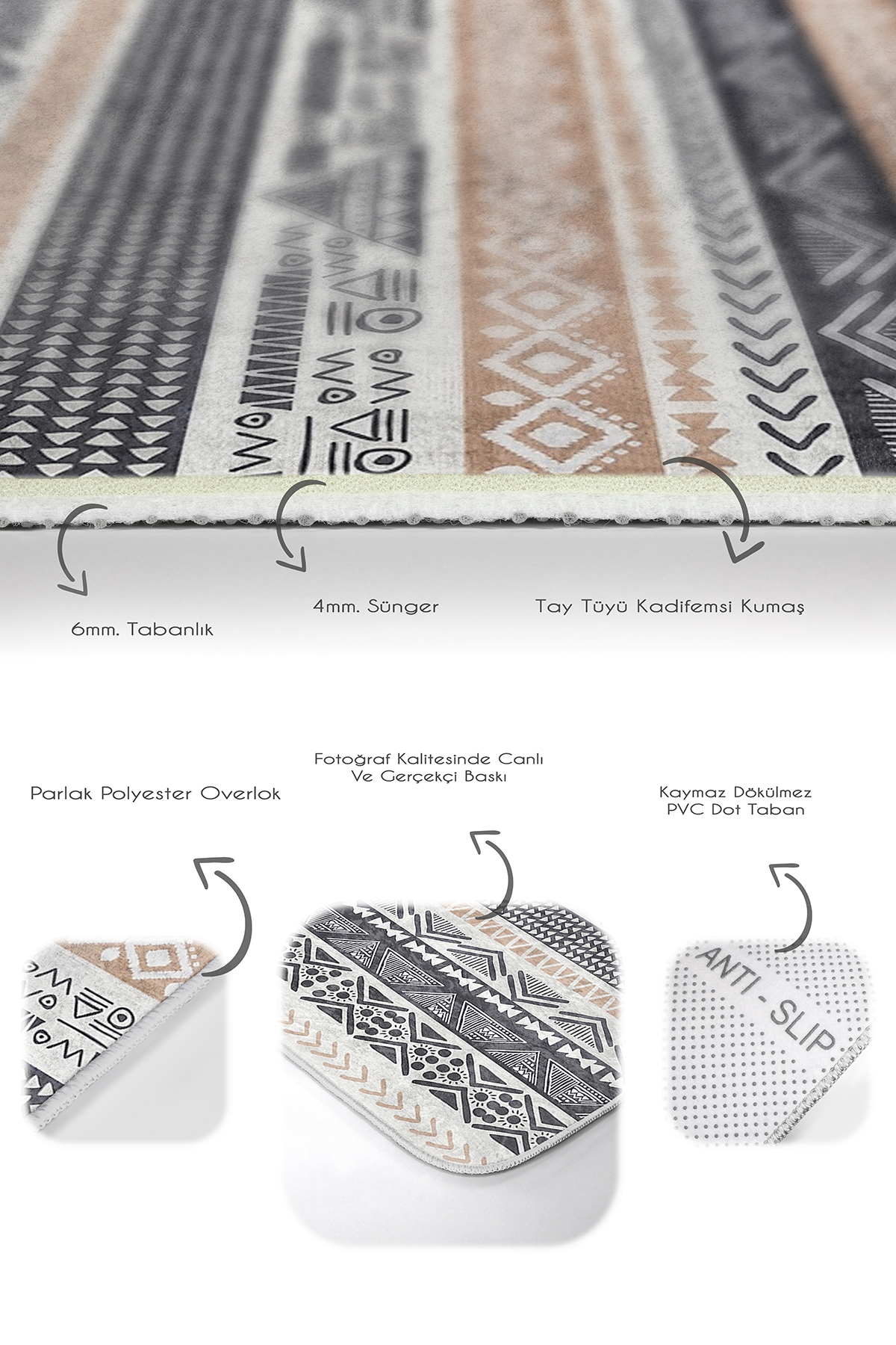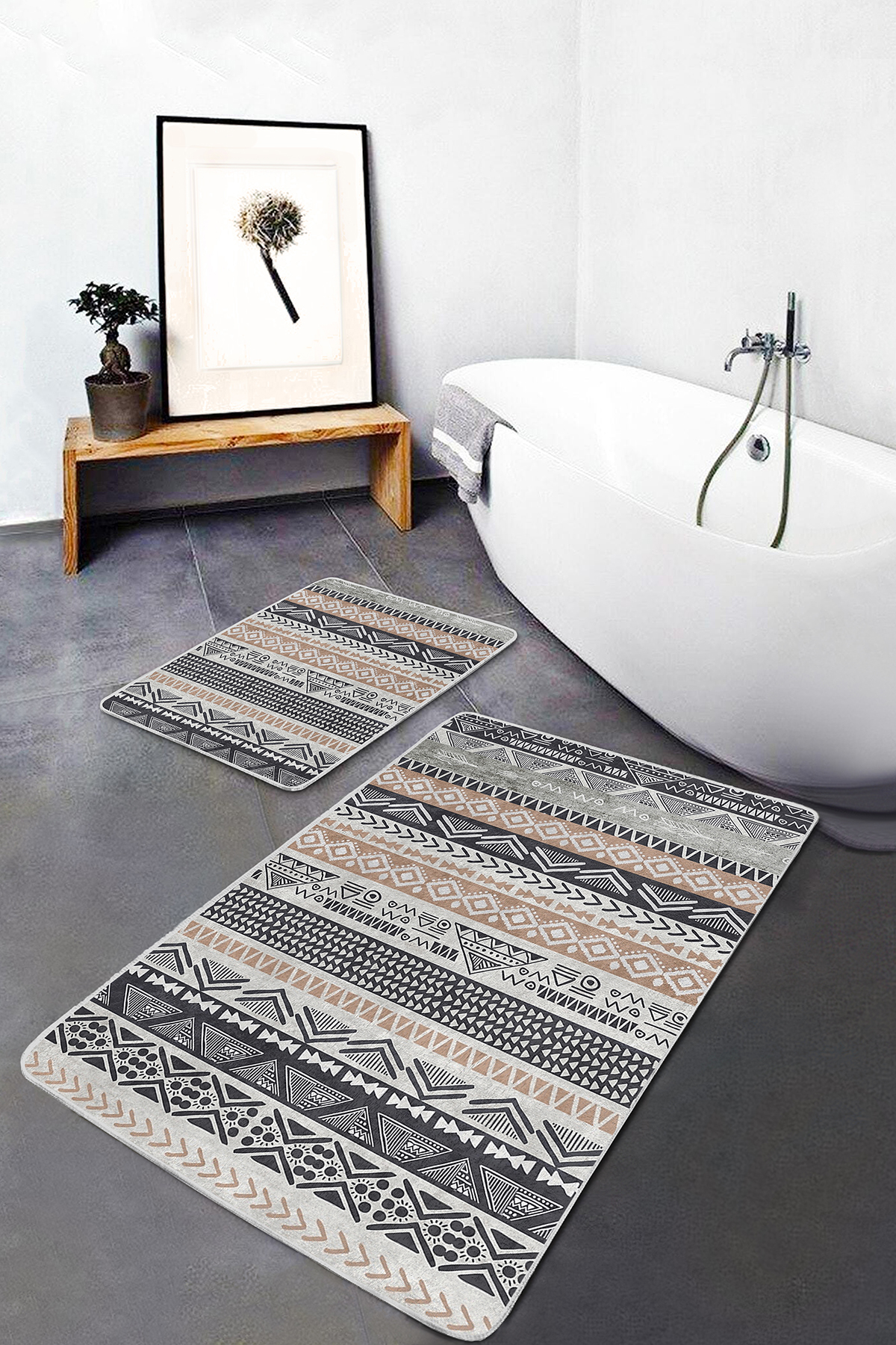 2’li Set Krem – Gri Zeminde İskandinav Motifli Kilim Desenli Geometrik Etnik Motifler 2’li Banyo & Mutfak Paspas Takımı