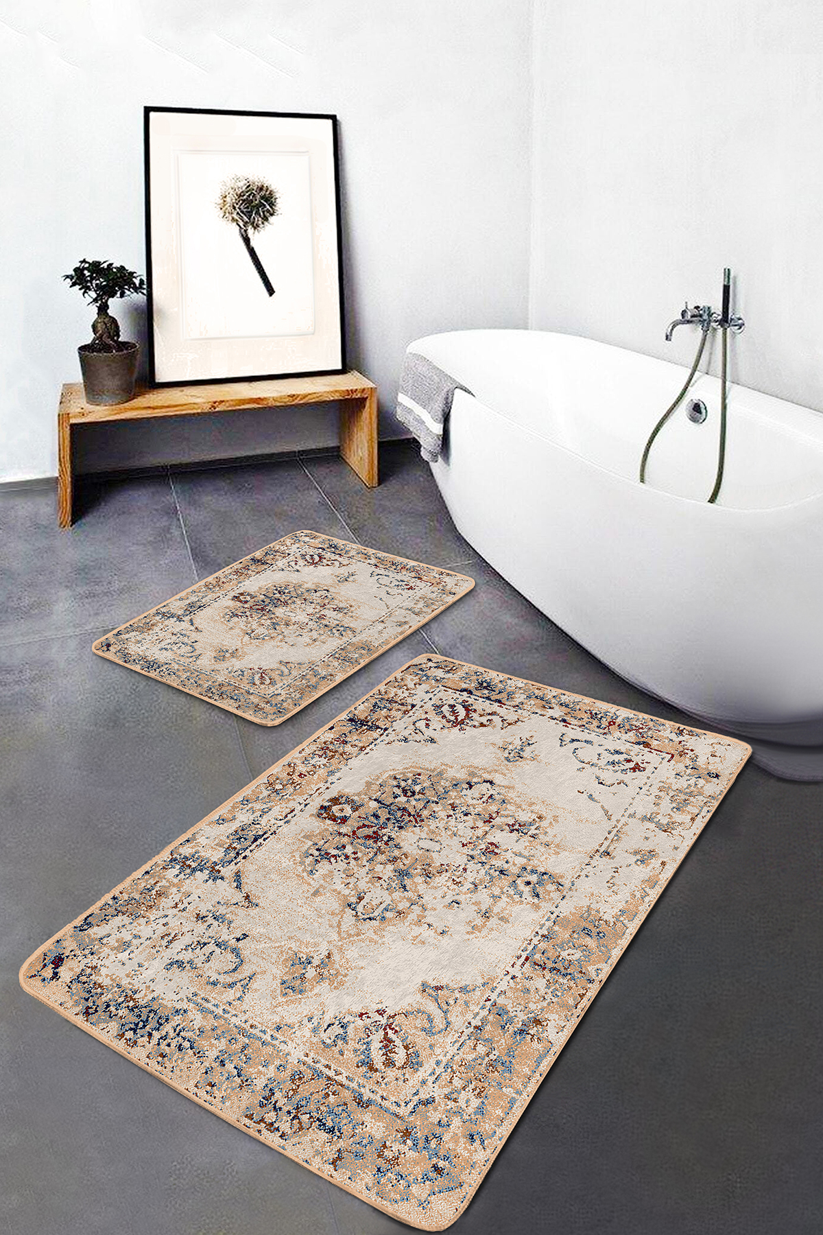 2’li Set Krem Zeminde Eskitme Motifli Hereke Desenli Eskitme Motifli Avangarde 2’li Banyo & Mutfak Paspas Takımı