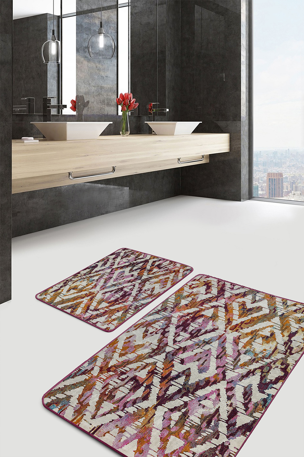 2'li Set Kırmızı Zeminde Geometrik Motifli Mozaik Desenli Geometrik Sade & Şık 2'li Banyo & Mutfak Paspas Takımı
