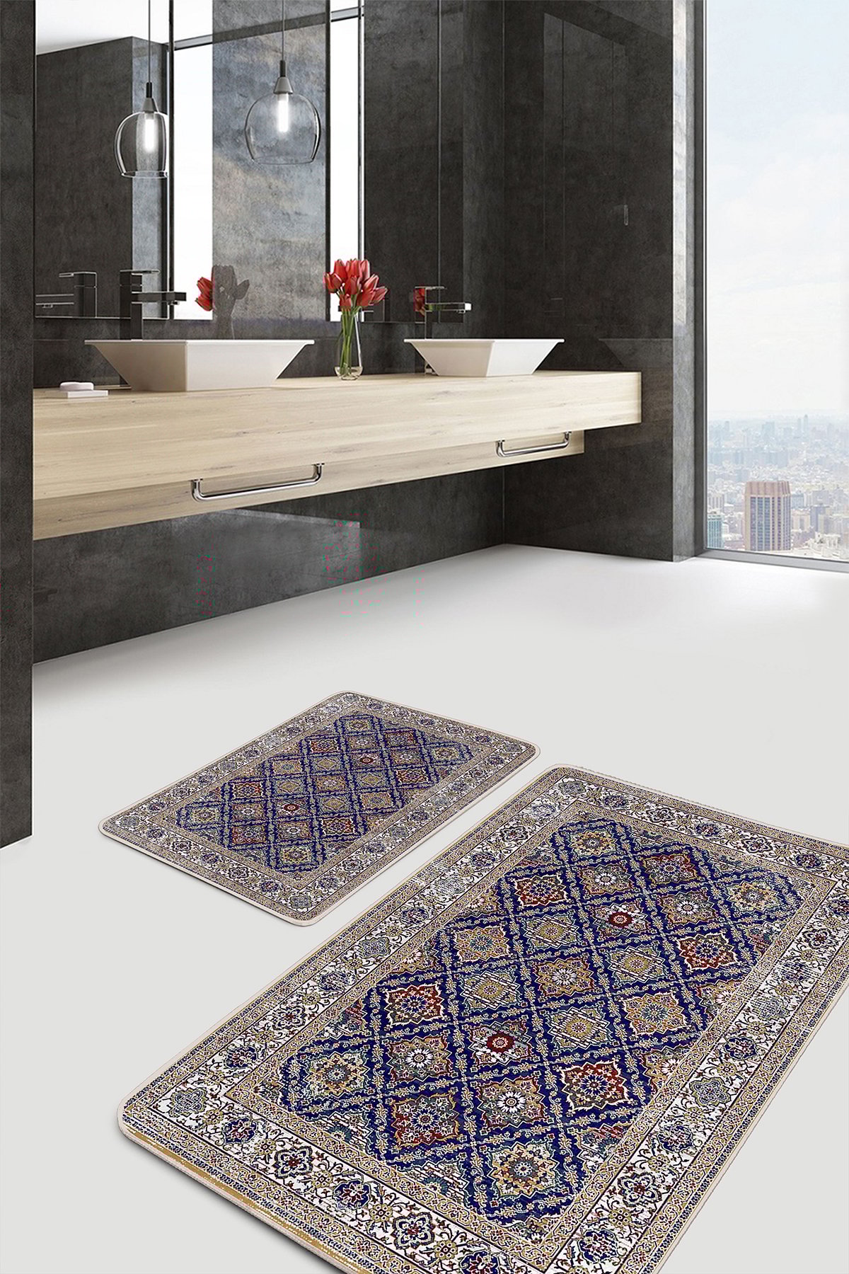 2’li Set Lacivert Zeminde Uşak Motifli Geleneksel Desenli Vintage Avangarde 2’li Banyo & Mutfak Paspas Takımı