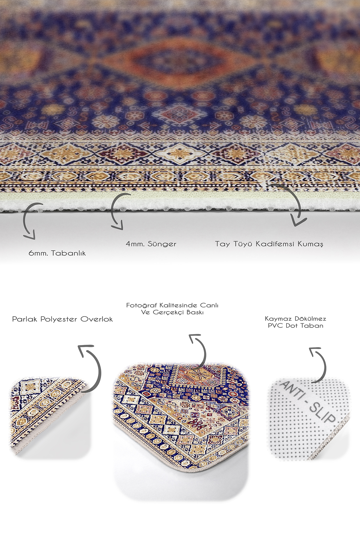 Tabanlık ve Dolgu: 6 mm Kaymaz dokuma tabanlıdır.