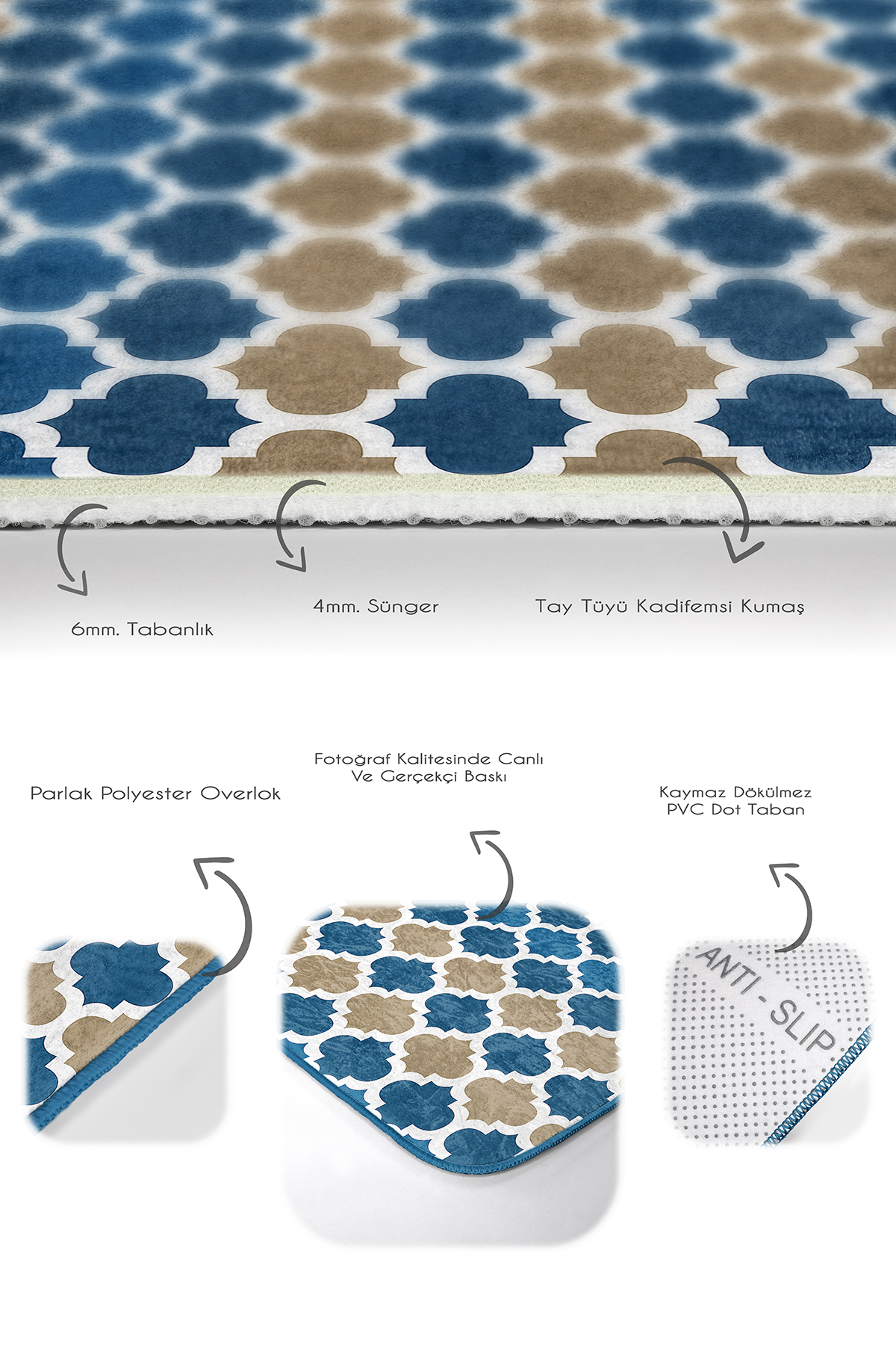 Tabanlık ve Dolgu: 6 mm Kaymaz dokuma tabanlıdır.