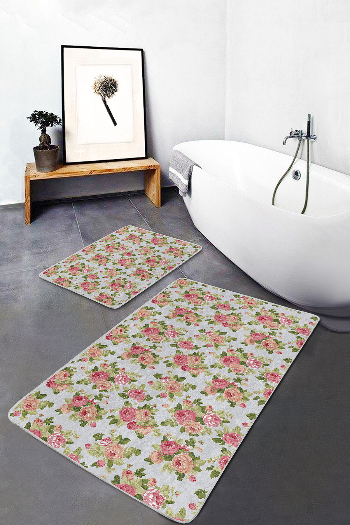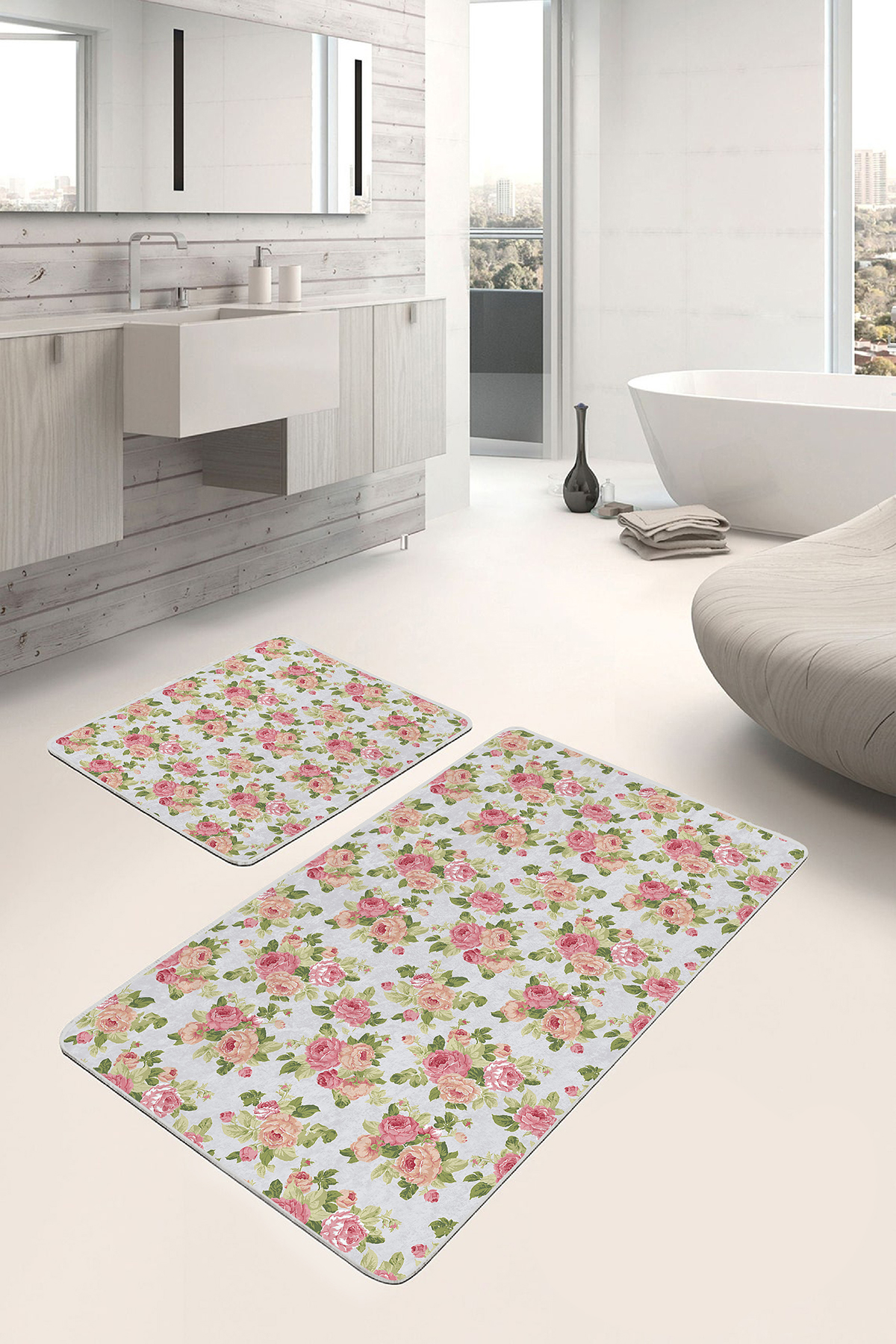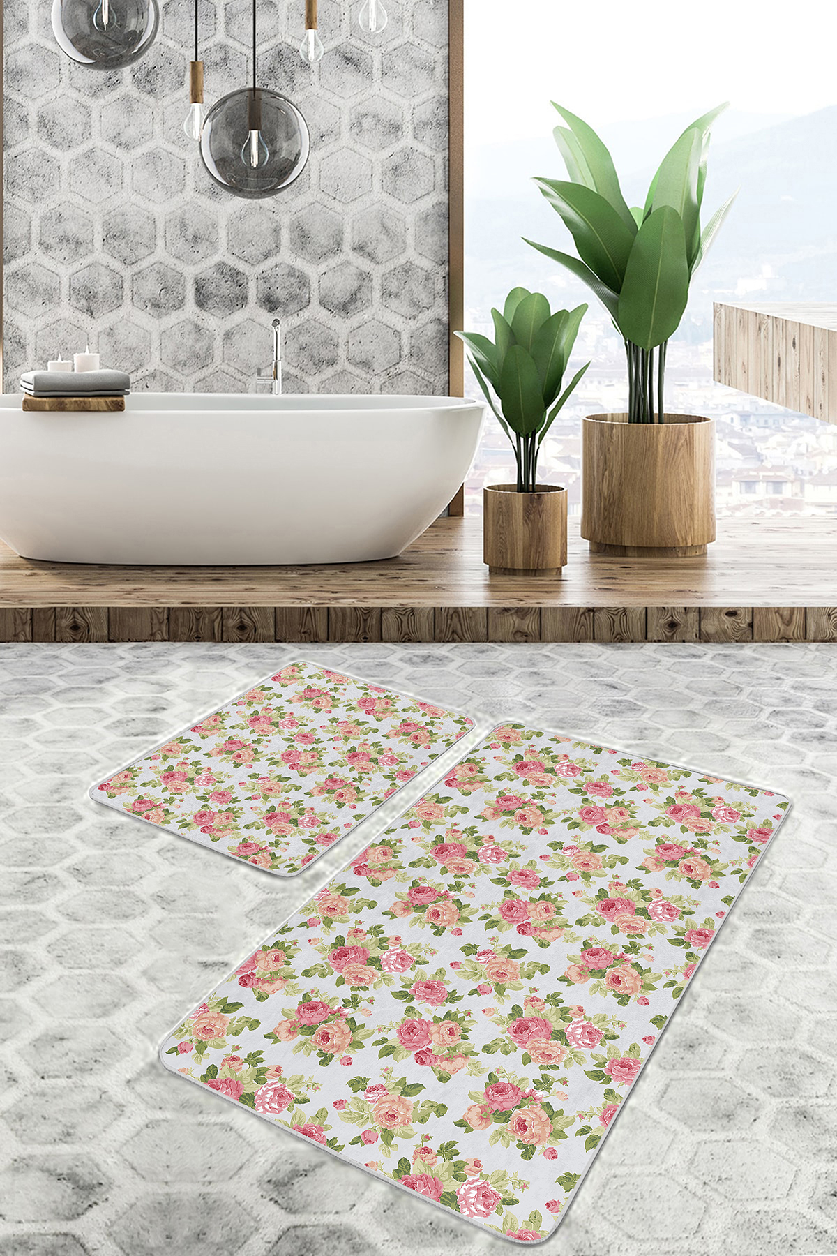 2’li Set Mavi – Pembe Zeminde Gül Motifli Floral Desenli Floral Sade & Şık 2’li Banyo & Mutfak Paspas Takımı