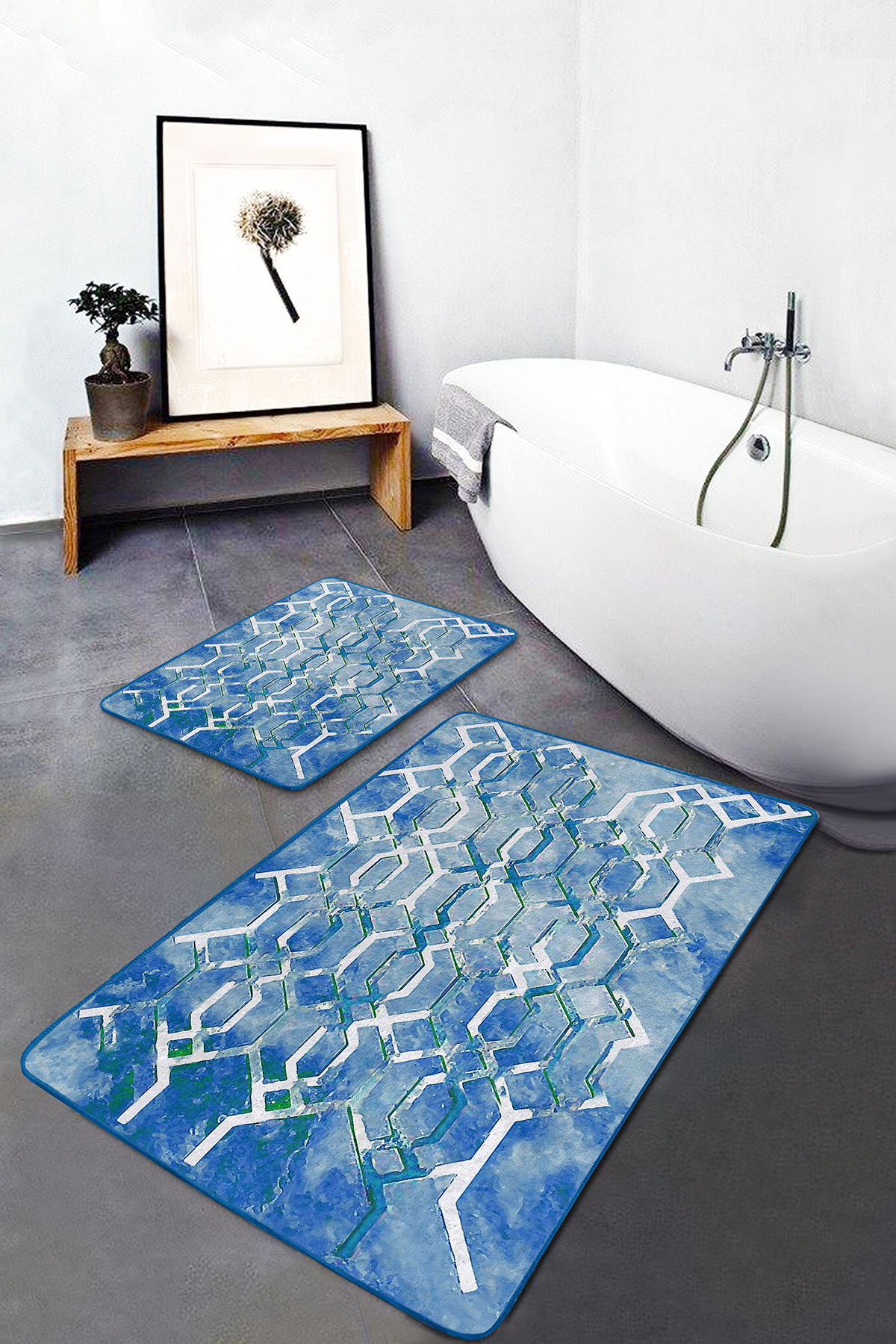 2’li Set Mavi Zeminde Kanvas Motifli Geometrik Desenli Eskitme Motifli Geometrik 2’li Banyo & Mutfak Paspas Takımı