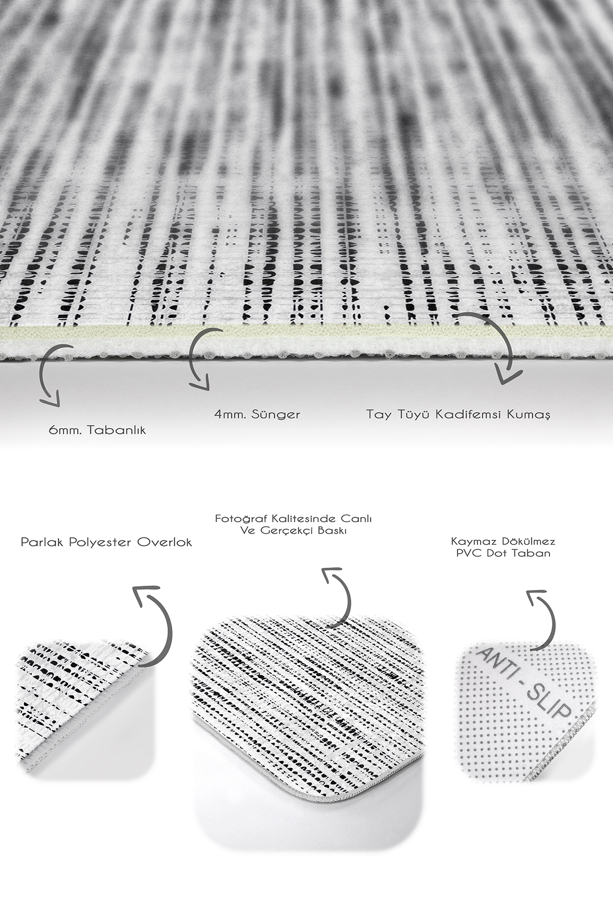 Tabanlık ve Dolgu: 6 mm Kaymaz dokuma tabanlıdır.
