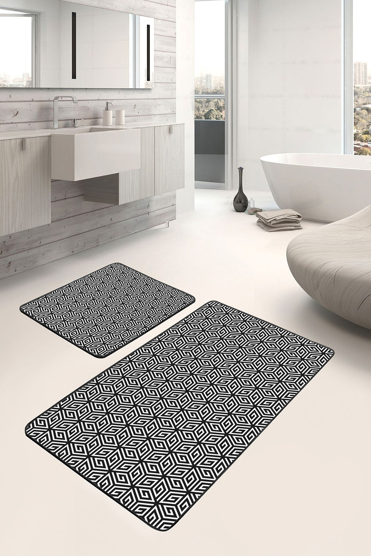 2'li Set Siyah Beyaz Zeminde Geometrik Motifli Mozaik Desenli Geometrik Sade & Şık  2'li Banyo & Mutfak Paspas Takımı Realhomes