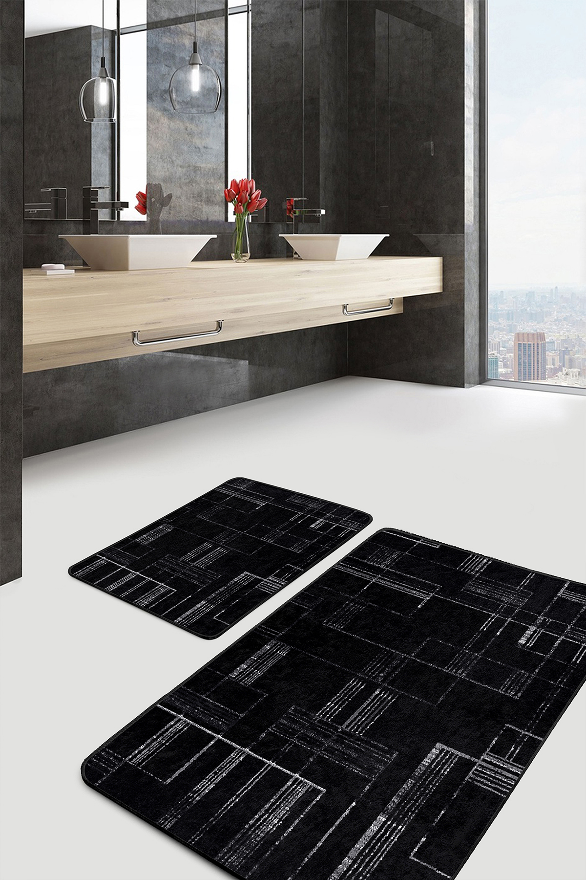 2’li Set Siyah – Beyaz Zeminde Siyah Motifli Kilim Desenli Sade & Şık Klasik 2’li Banyo & Mutfak Paspas Takımı