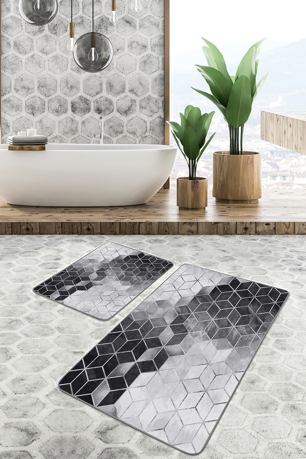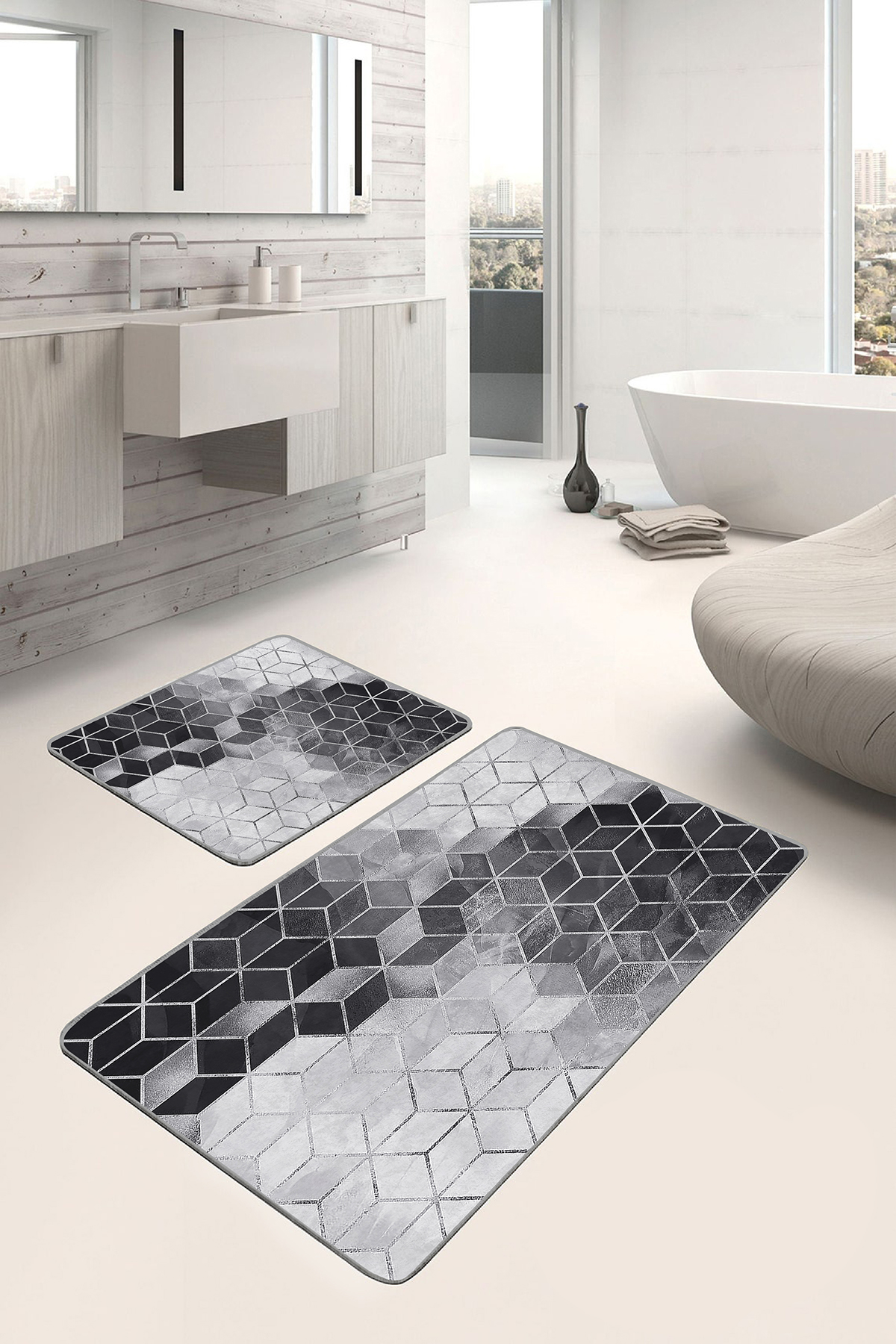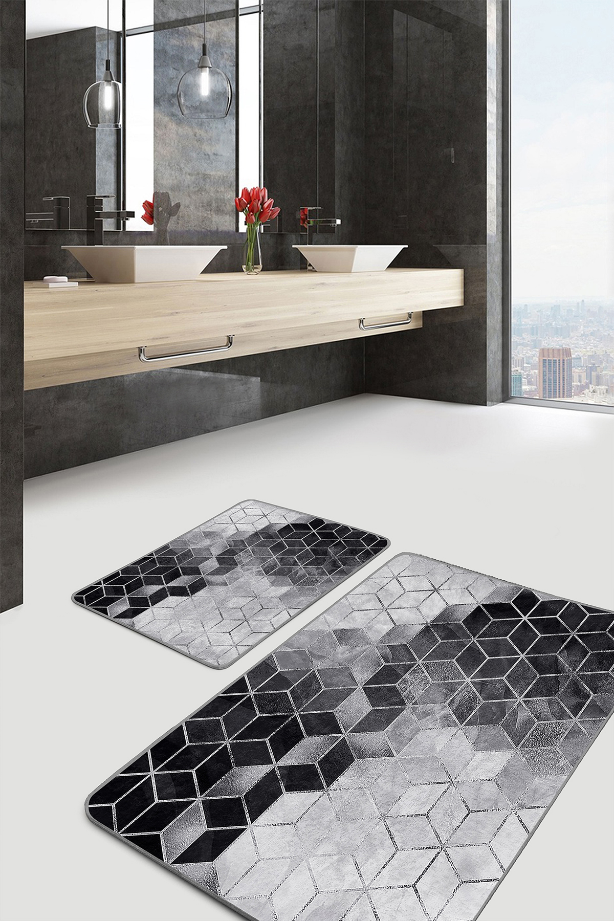 2’li Set Siyah – Gri Zeminde Mozaik Motifli Mermer Desenli Geometrik Klasik 2’li Banyo & Mutfak Paspas Takımı