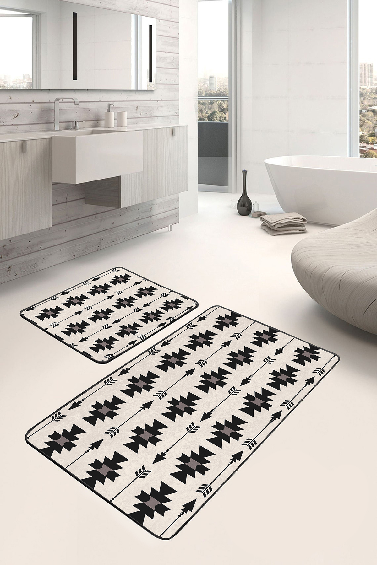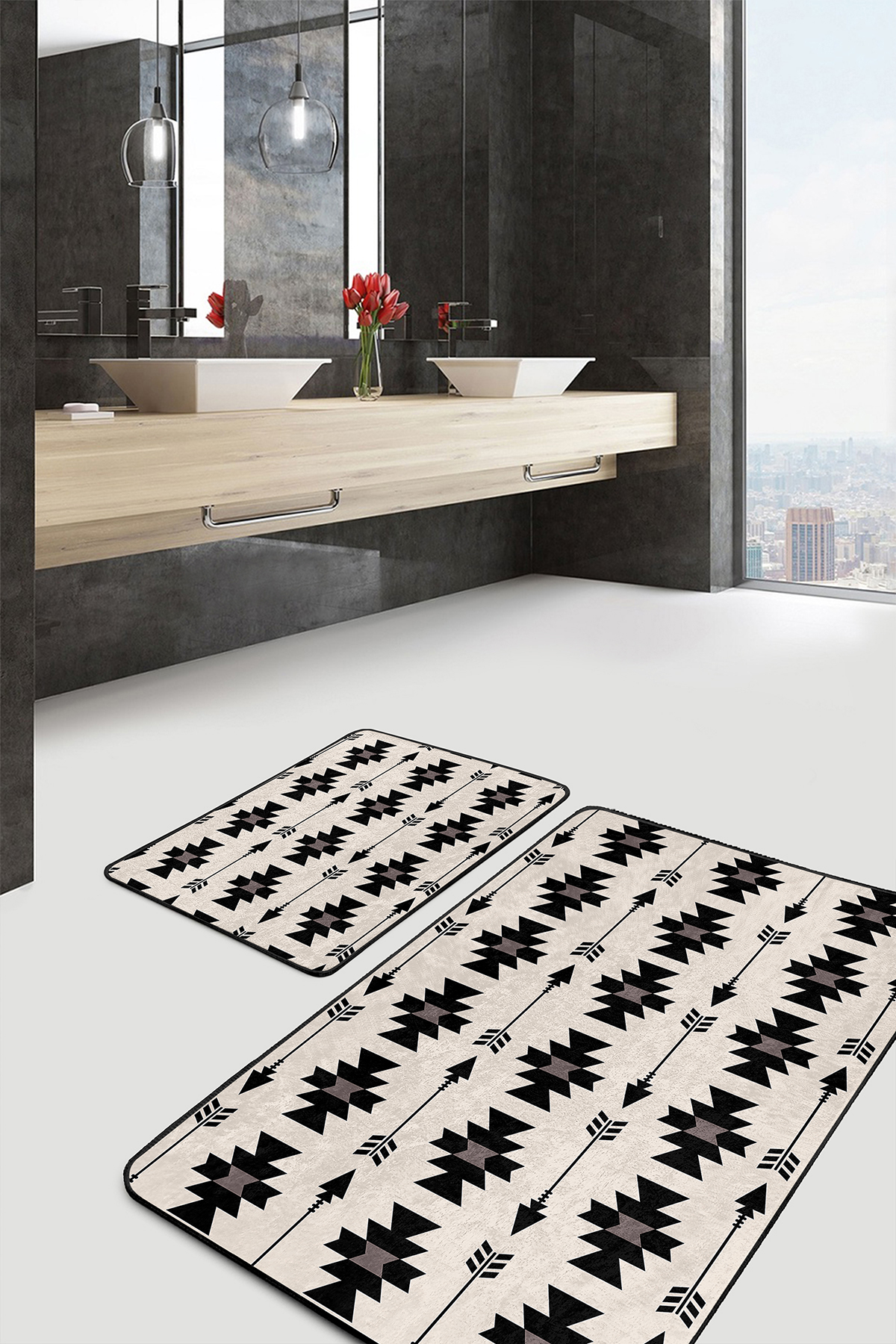 2'li Set Siyah - Krem Zeminde Kilim Motifli Geometrik Desenli Geometrik Sade & Şık  2'li Banyo & Mutfak Paspas Takımı Realhomes