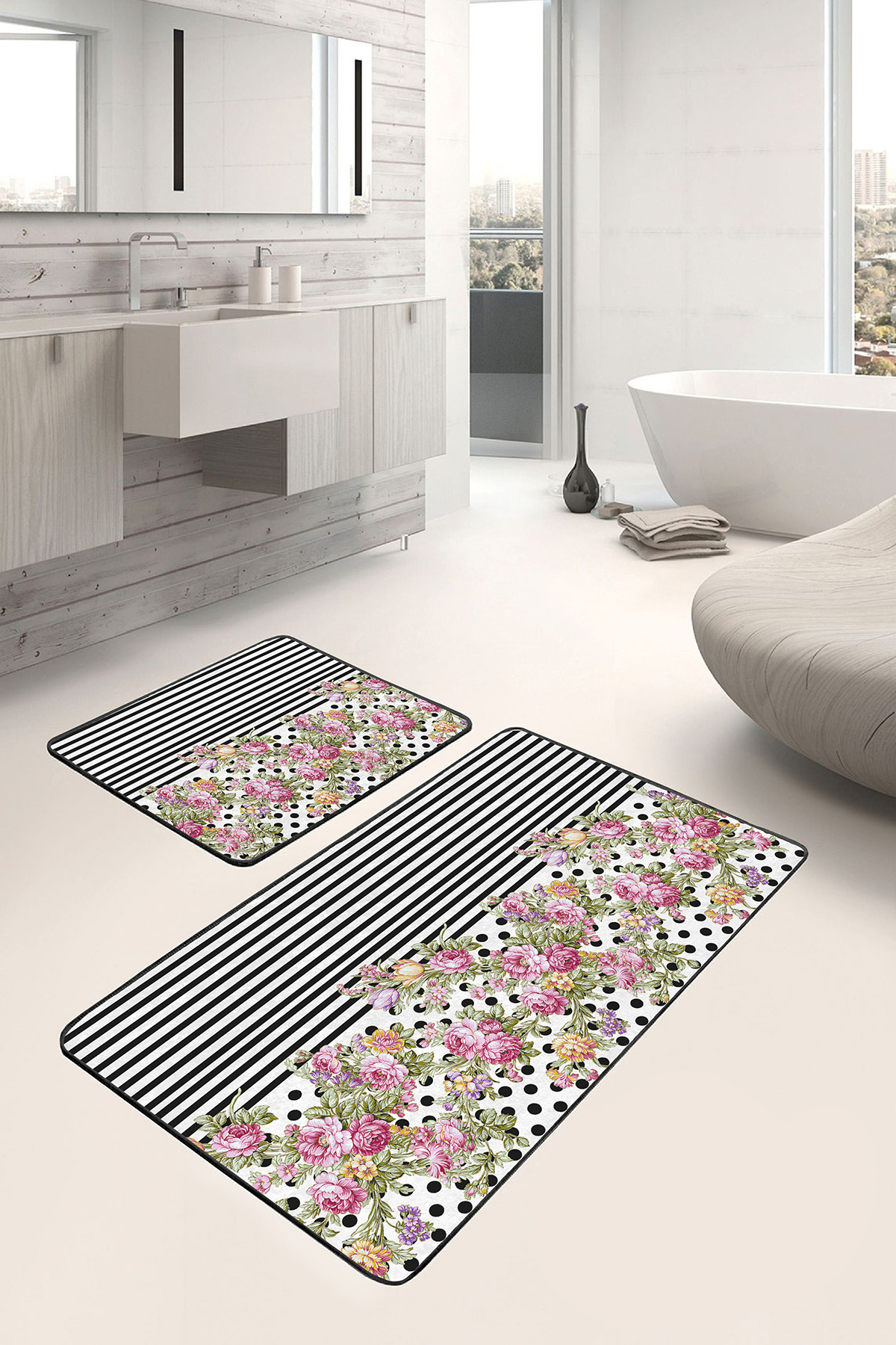 2’li Set Siyah – Pembe Zeminde Geometrik Motifli Çiçek Desenli Geometrik Floral 2’li Banyo & Mutfak Paspas Takımı