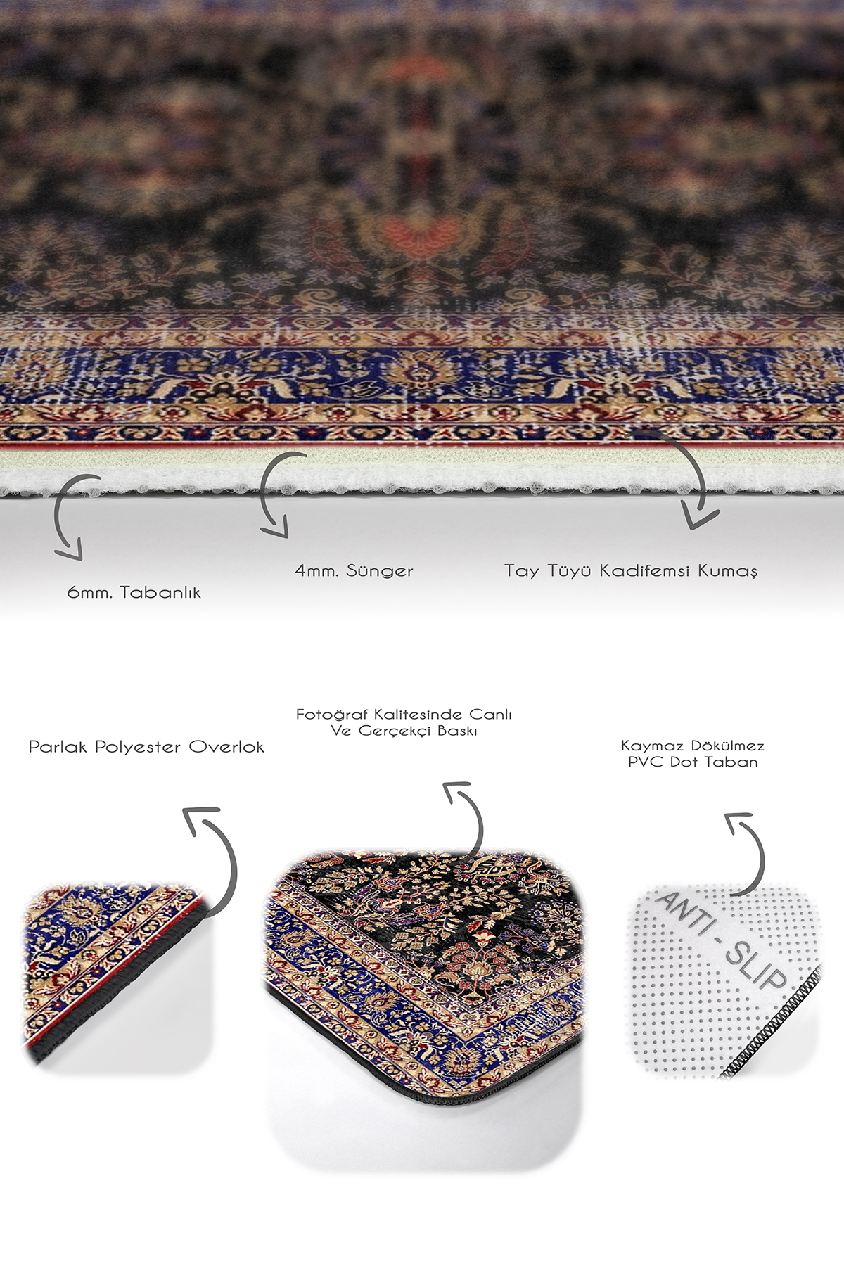 Tabanlık ve Dolgu: 6 mm Kaymaz dokuma tabanlıdır.