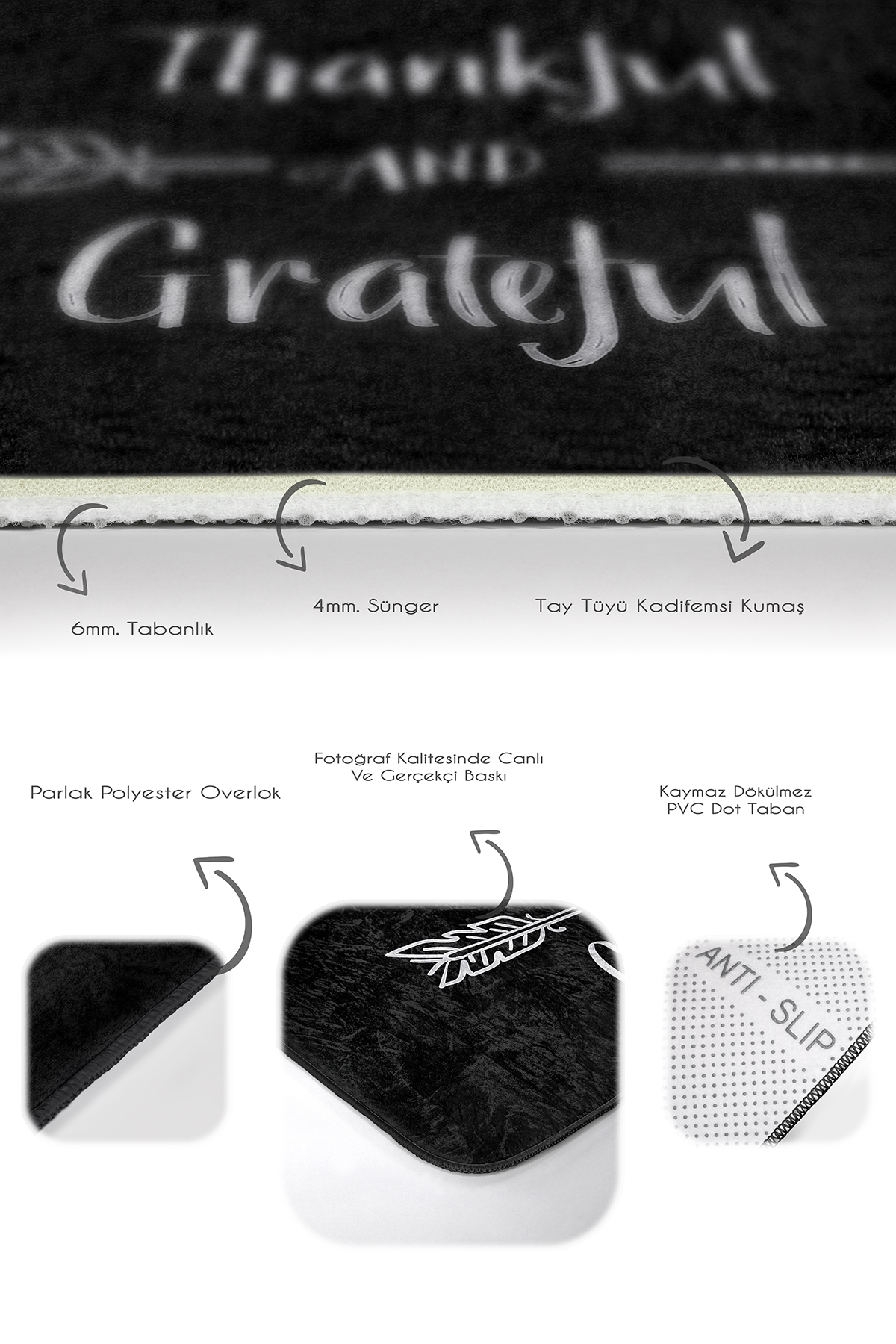 2’li Set Siyah Zeminde Yazı Motifli Thankful Desenli Sade & Şık Klasik 2’li Banyo & Mutfak Paspas Takımı
