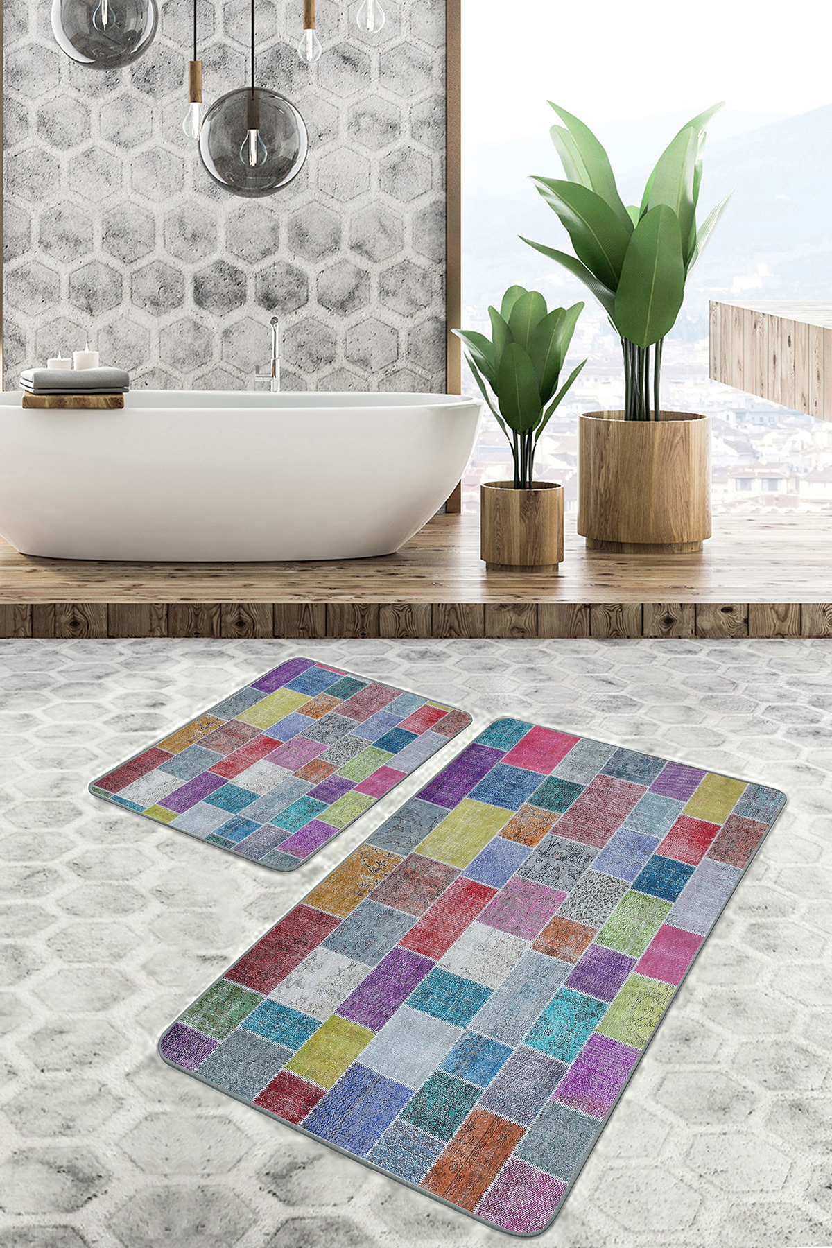 2’li Set Yöresel Zeminde Patchwork Motifli Anadolu Desenli Vintage Klasik 2’li Banyo & Mutfak Paspas Takımı