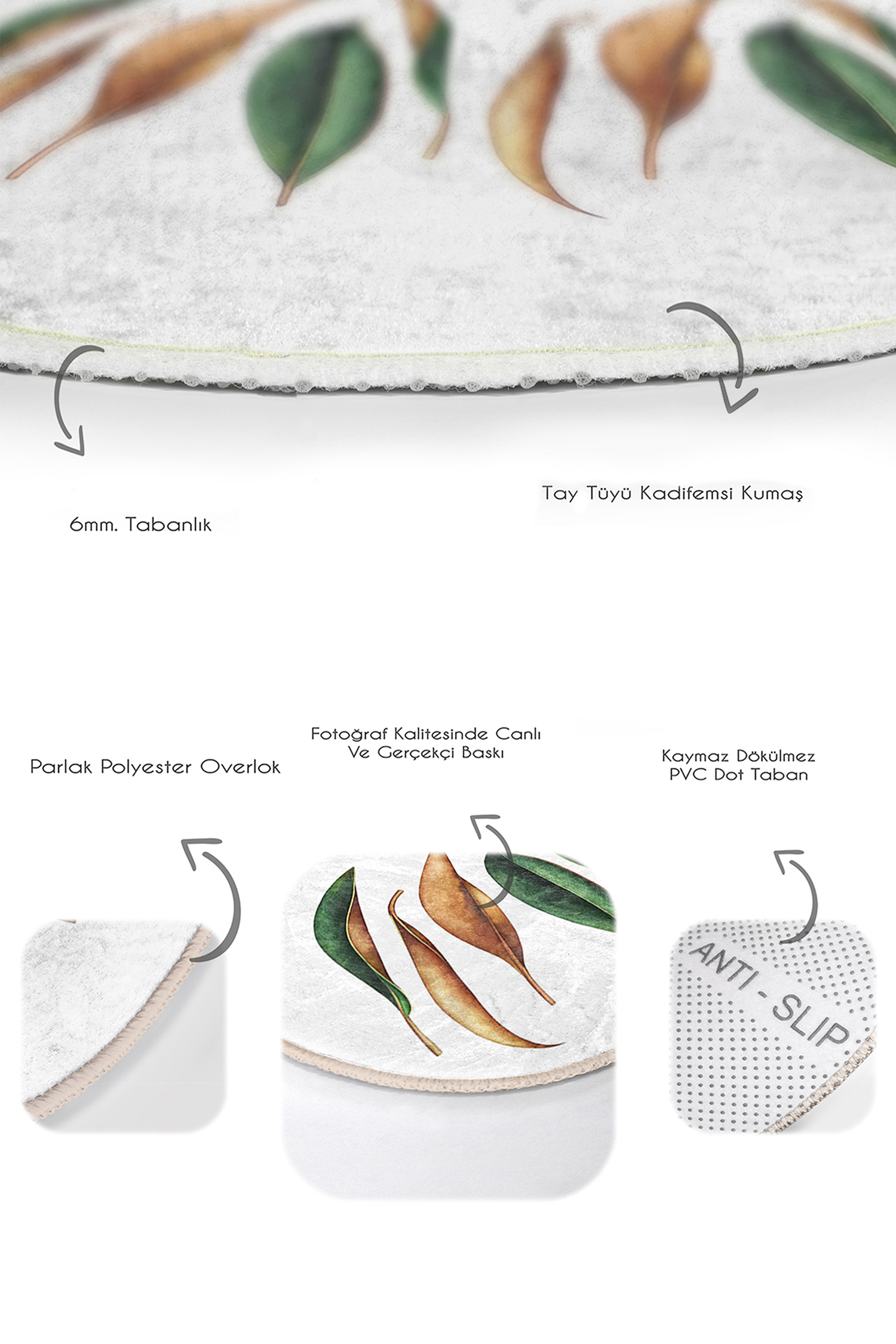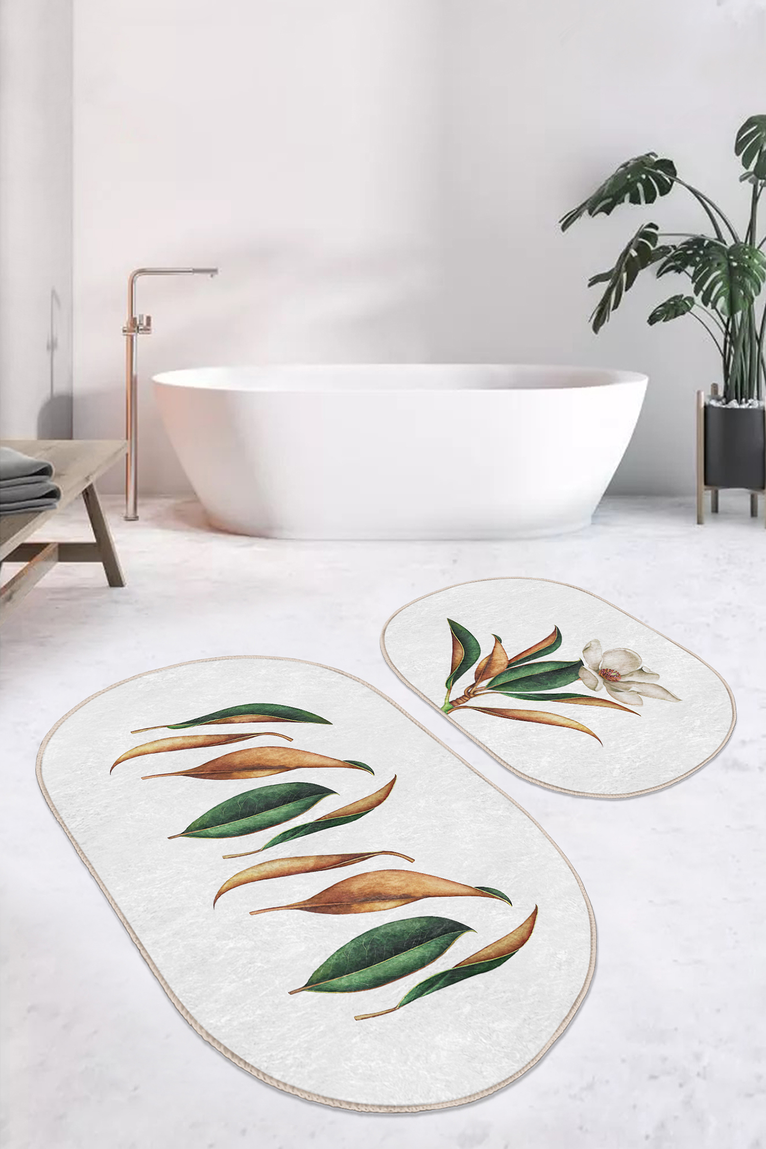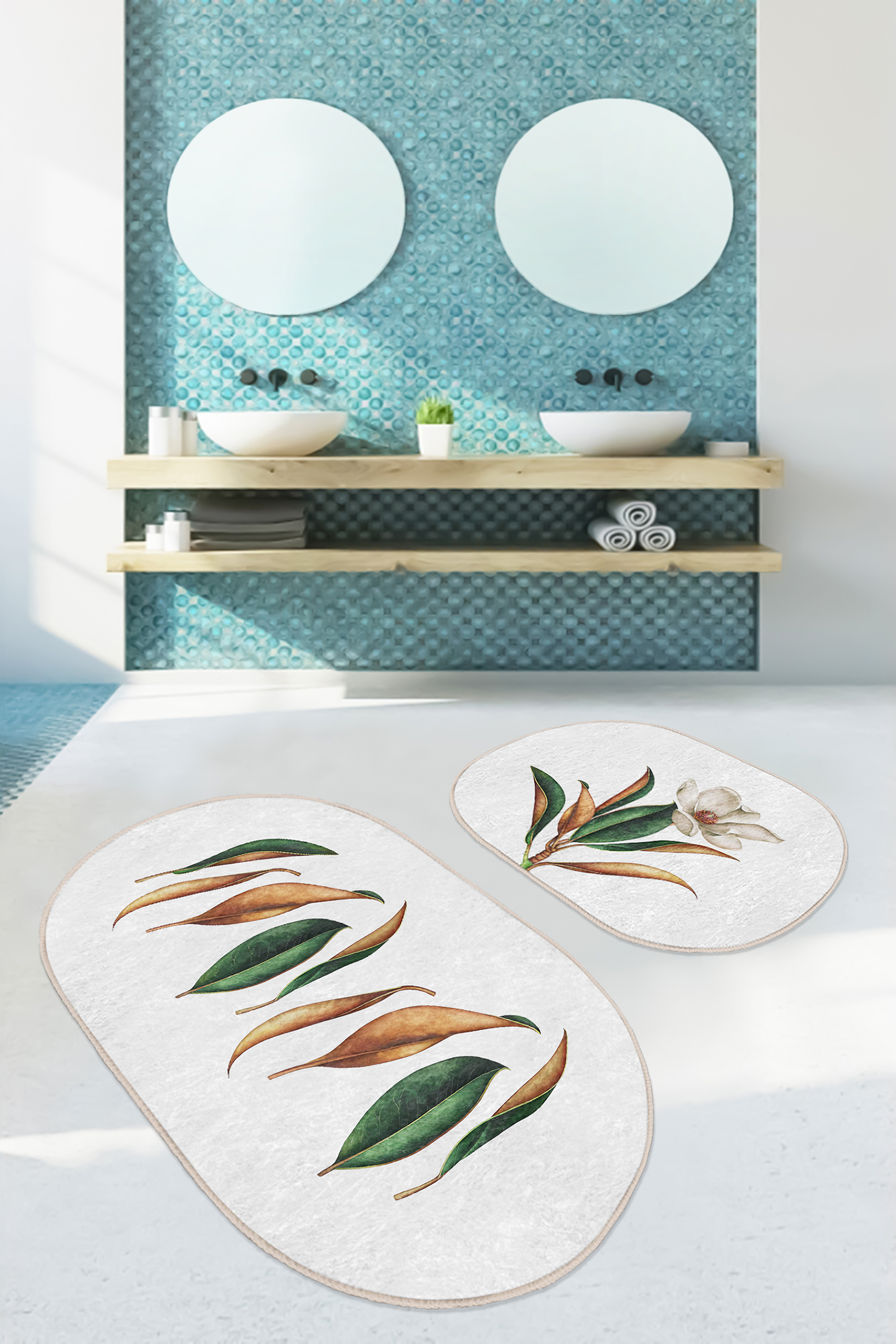 3D Tropik Yaprak Motifli 2’li Oval Kaymaz Tabanlı Banyo Paspas Seti & Mutfak Paspas Takımı
