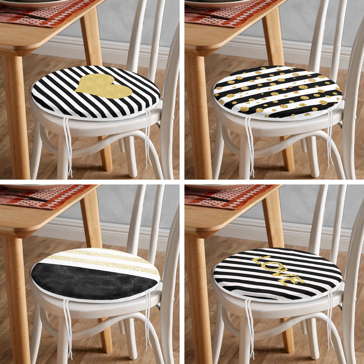 4'lü Beyaz Zemin Üzerinde Gold Detaylı Geometrik Desenli Modern Yuvarlak Fermuarlı Sandalye Minderi Seti Realhomes