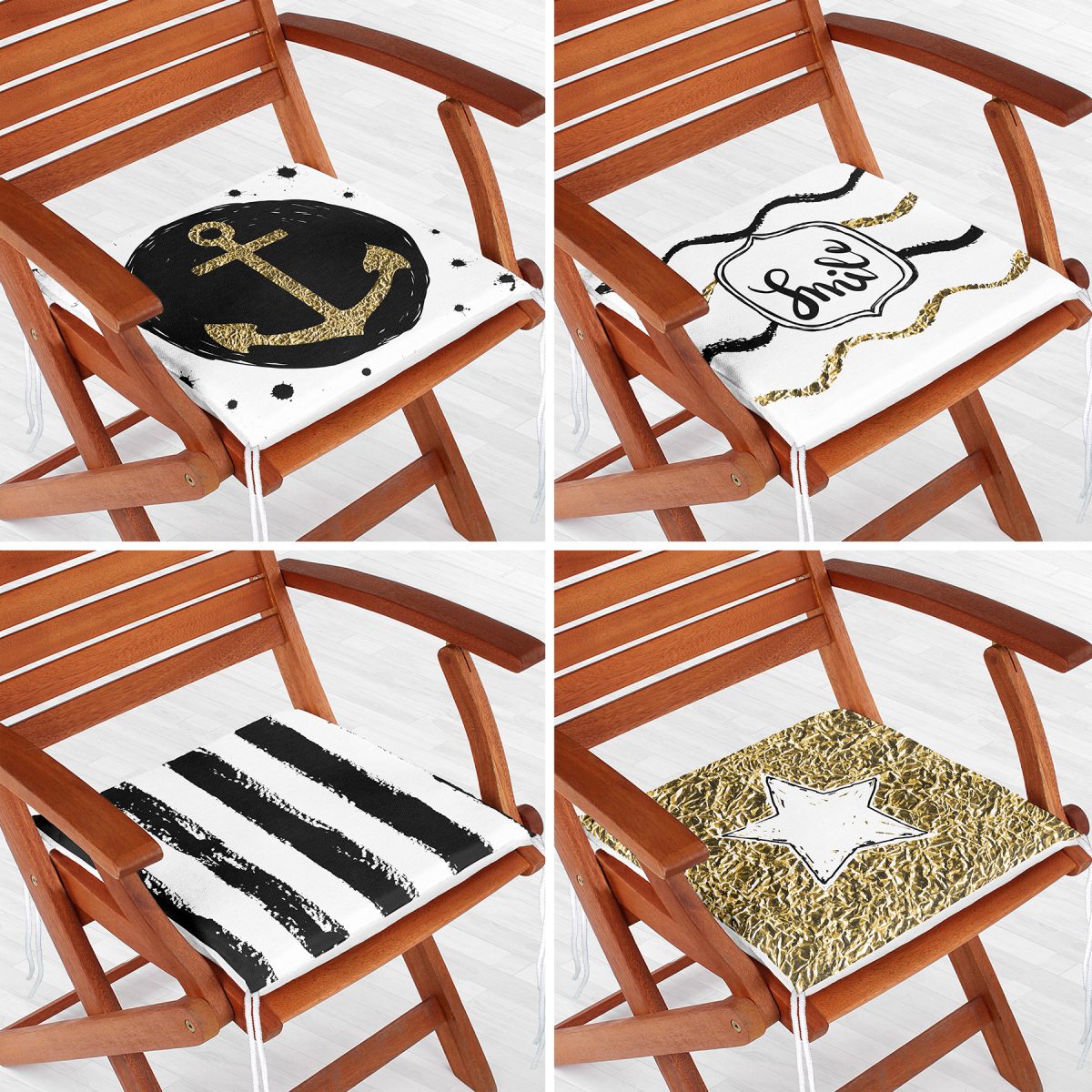 4’lü Beyaz Zemin Üzerinde Gold Detaylı Modern Fermuarlı Sandalye Minderi Seti