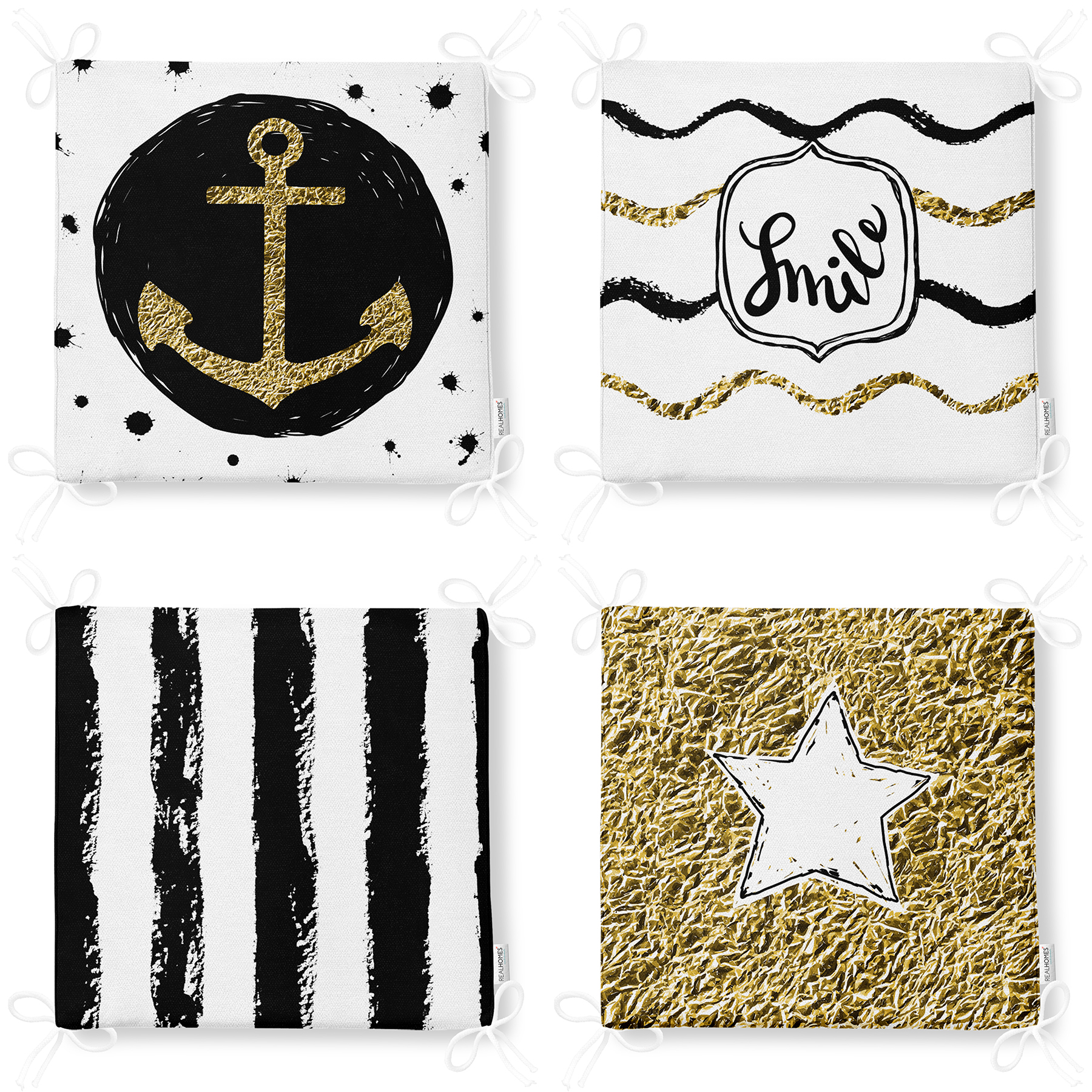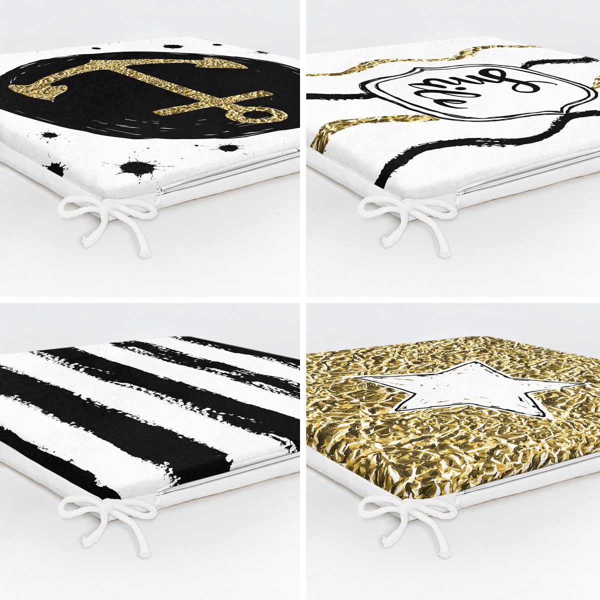 4'lü Beyaz Zemin Üzerinde Gold Detaylı Modern Fermuarlı Sandalye Minderi Seti Realhomes