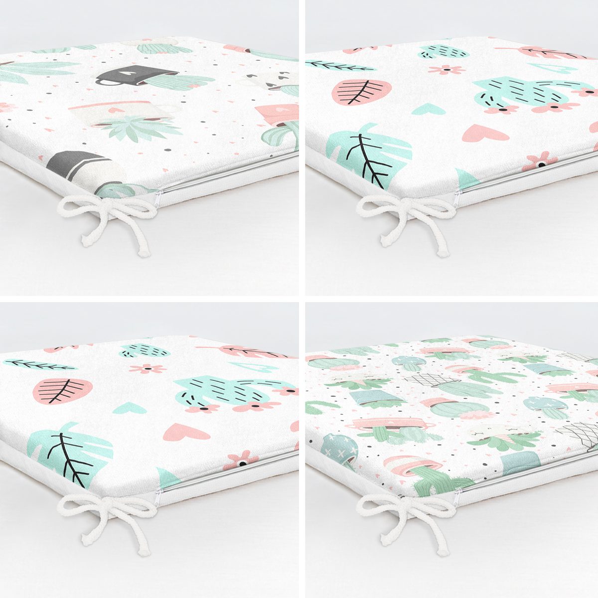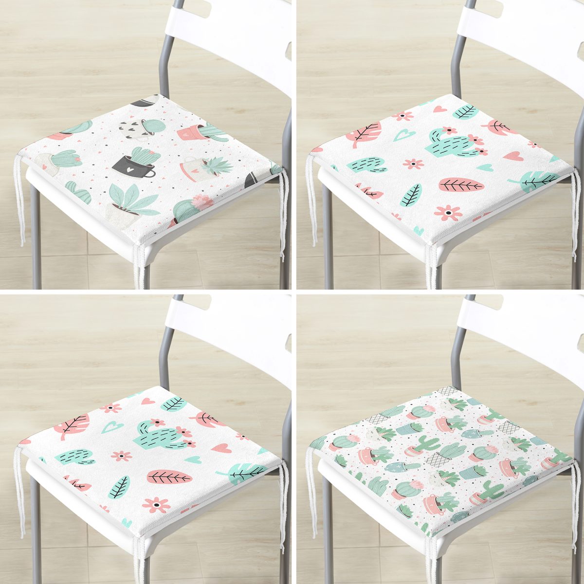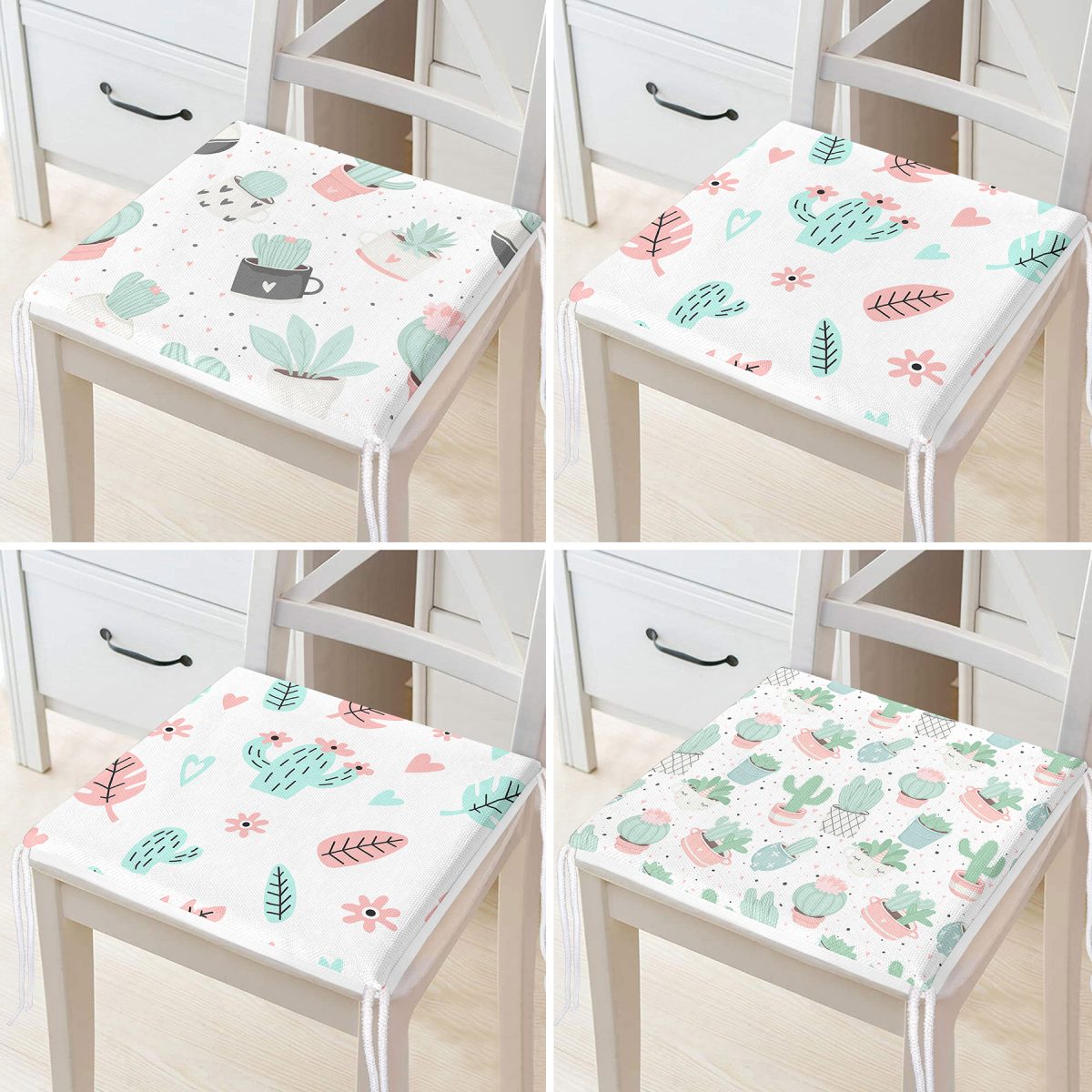 4’lü Beyaz Zemin Üzerinde Kaktüs Desenli Modern Fermuarlı Sandalye Minderi Seti