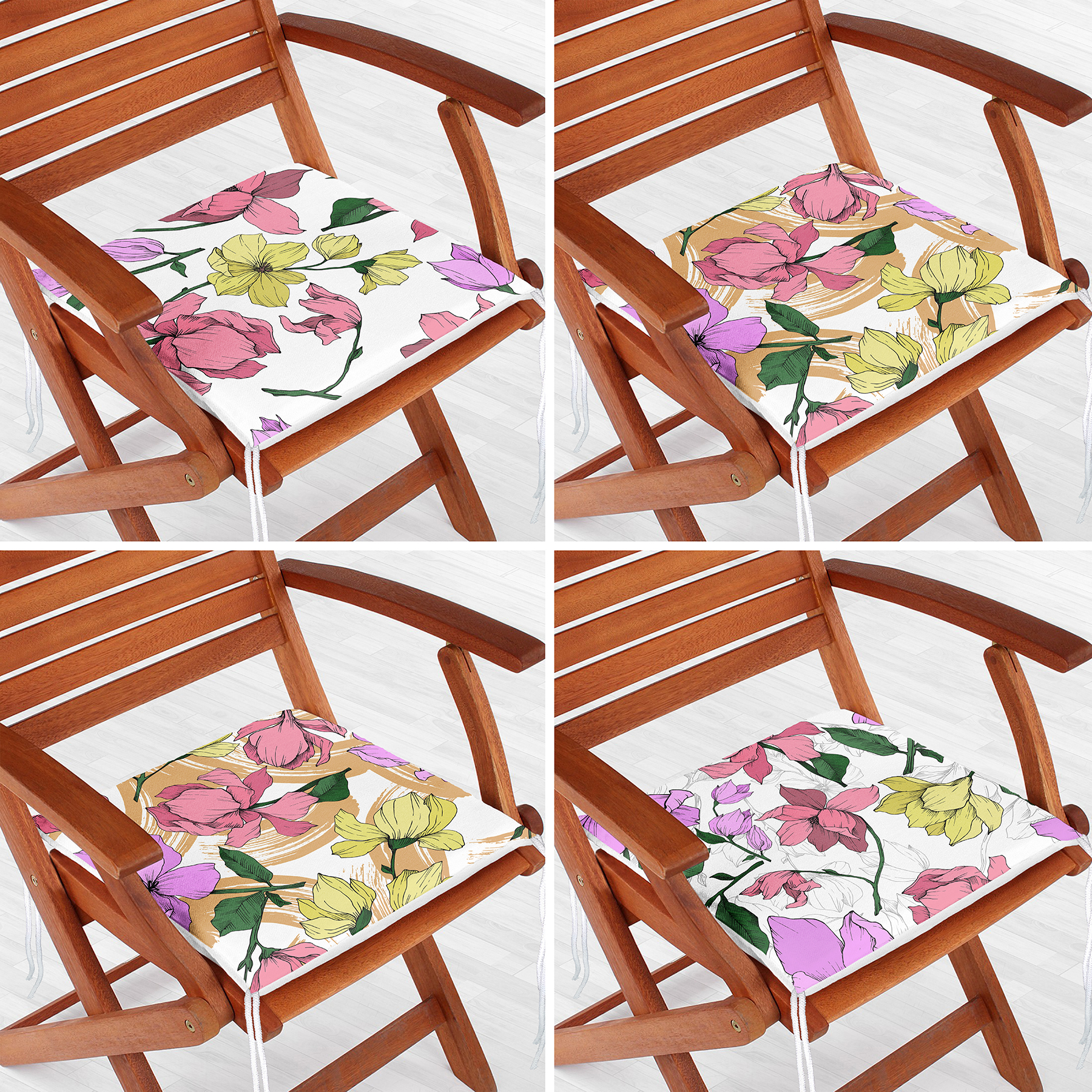 4’lü Beyaz Zemin Üzerinde Renkli Çiçek Desenli Modern Fermuarlı Sandalye Minderi Seti